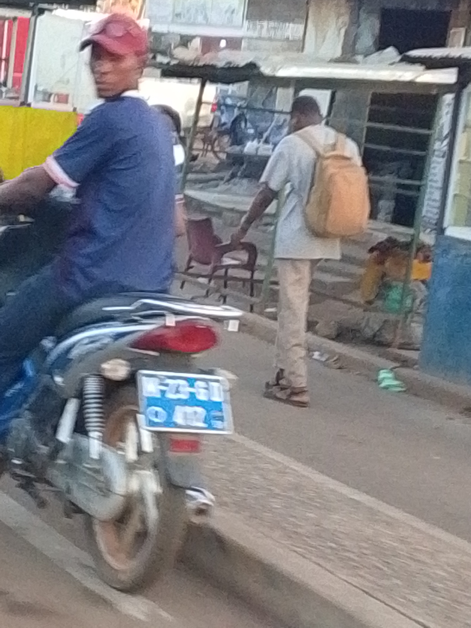 The image depicts a street scene in Tamale, Ghana. A man wearing a red cap and a blue shirt is sitting on a parked moped with a blue license plate reading "N-23-GI 012." Another man, wearing light-col…read more