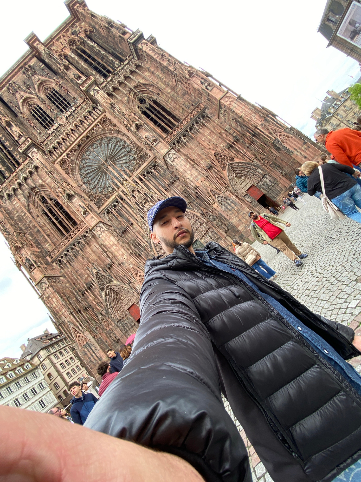 The image shows the Strasbourg Cathedral in Strasbourg, France. The Cathedral is on the left side of the image, showing its intricate facade with windows and decorative elements. A group of people areβ¦read more