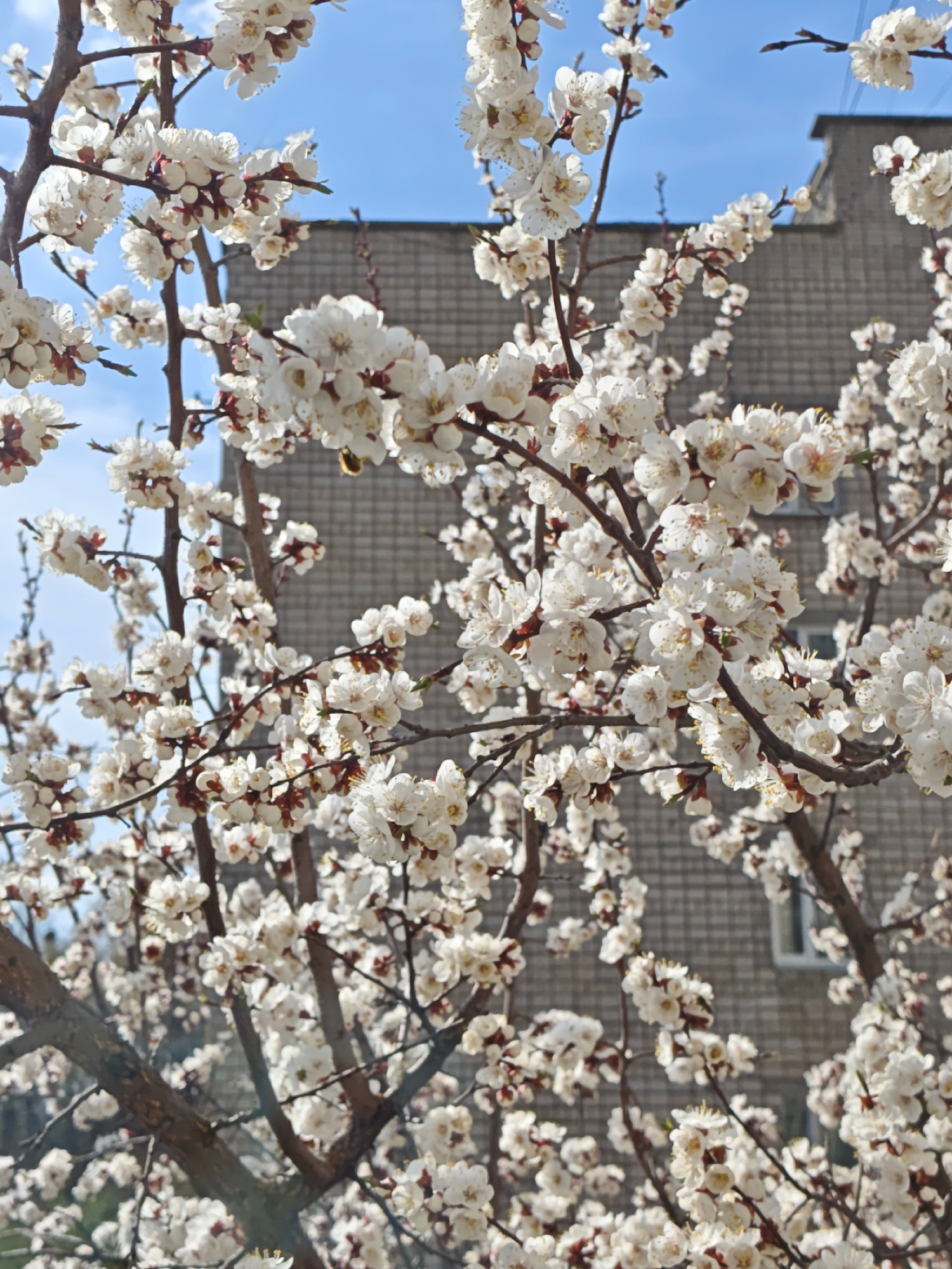 A close-up view showcases a flowering tree laden with white blossoms, set against the backdrop of a gray brick building. The sky is visible in the upper portions of the image, exhibiting a light blue…read more