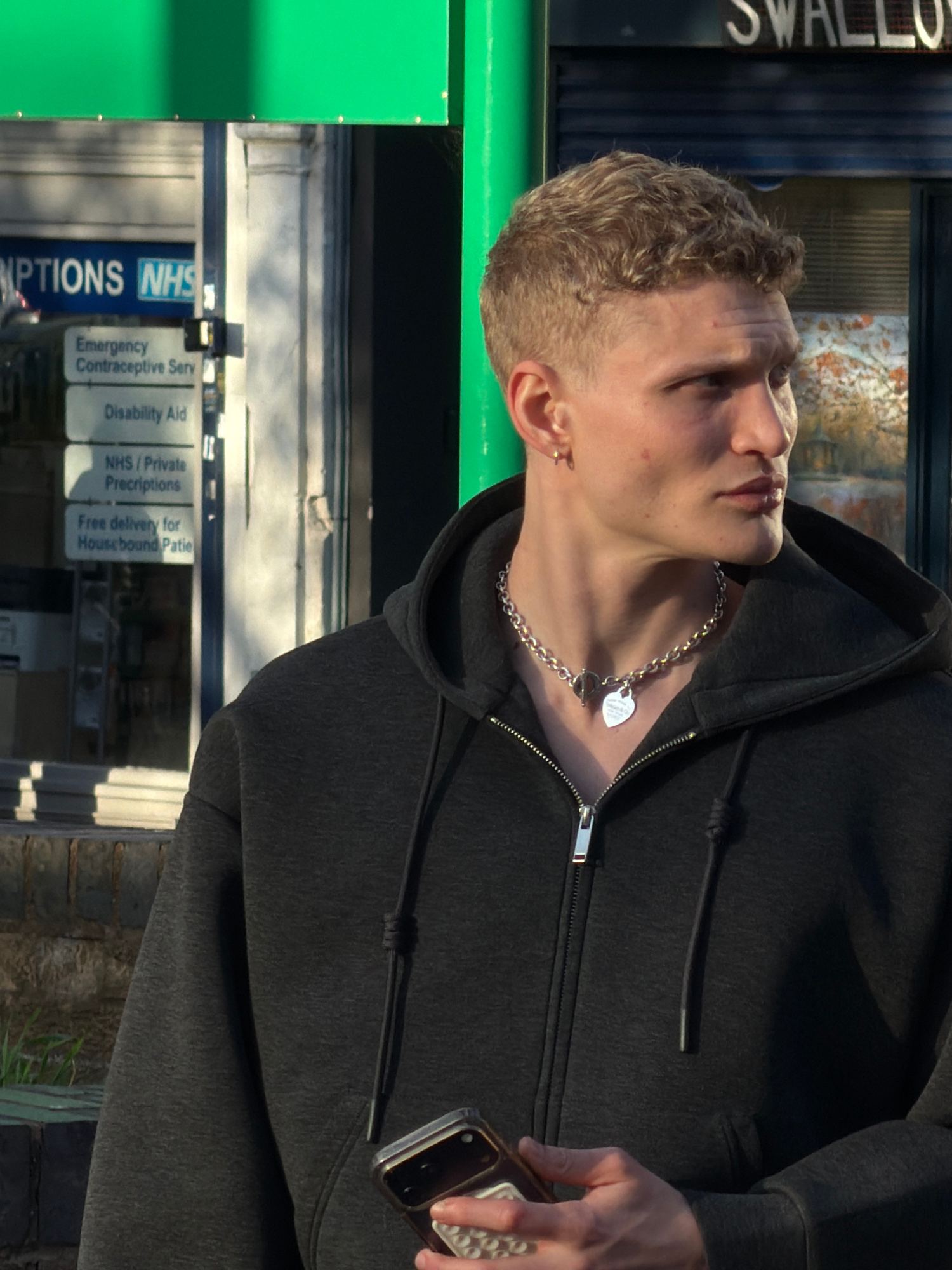 The image shows a fair-skinned individual wearing a dark grey zip-up hooded sweatshirt and a silver chain necklace with a heart-shaped pendant. They are holding a smartphone. The background includes s…read more