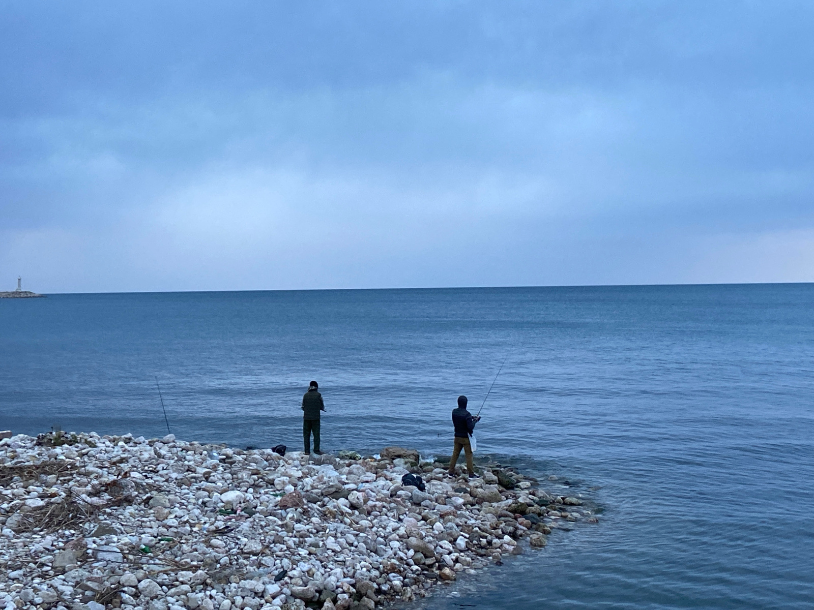 Two individuals are fishing along the rocky coastline in Bar, Montenegro. One person stands in the water, while the other stands on the rocks. Each holds a fishing rod. In the background, across the w…read more