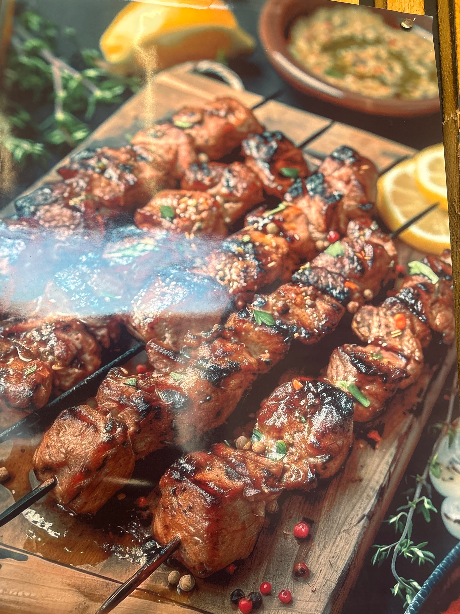 The image depicts a platter of grilled meat skewers served on a wooden board. The meat appears to be glazed and garnished with herbs and spices. Lemon wedges and a bowl of sauce are also present. A sp…read more