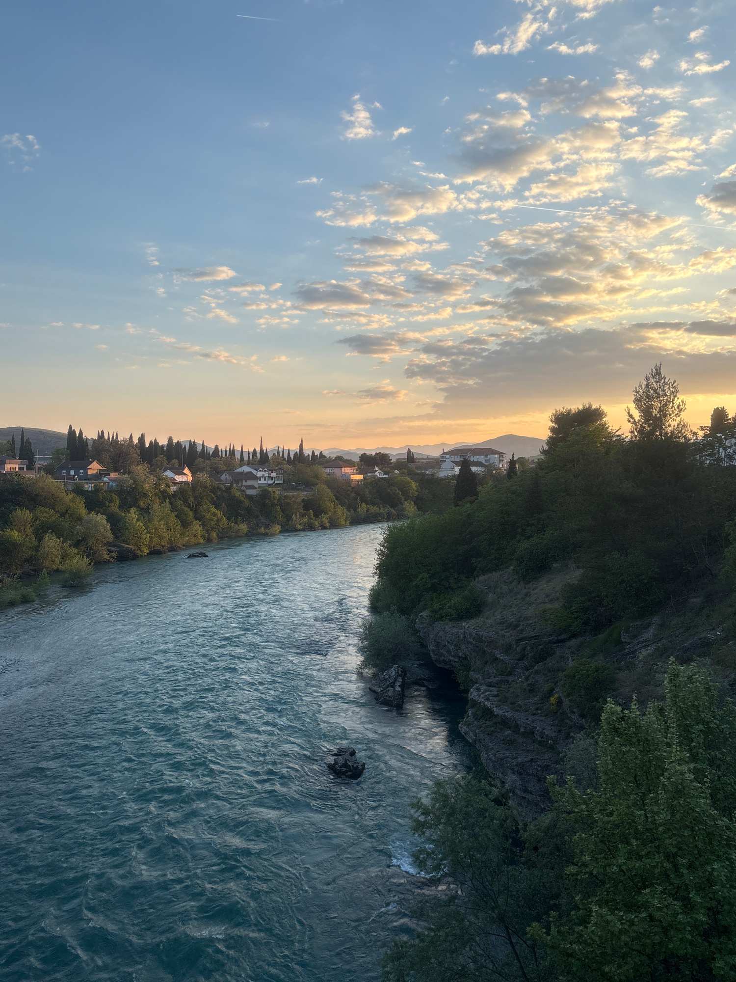 The image depicts a river landscape in Podgorica, Montenegro, taken from an elevated position. The river, with turbulent water, flows vertically from the top right to the bottom right corner. On the r…read more