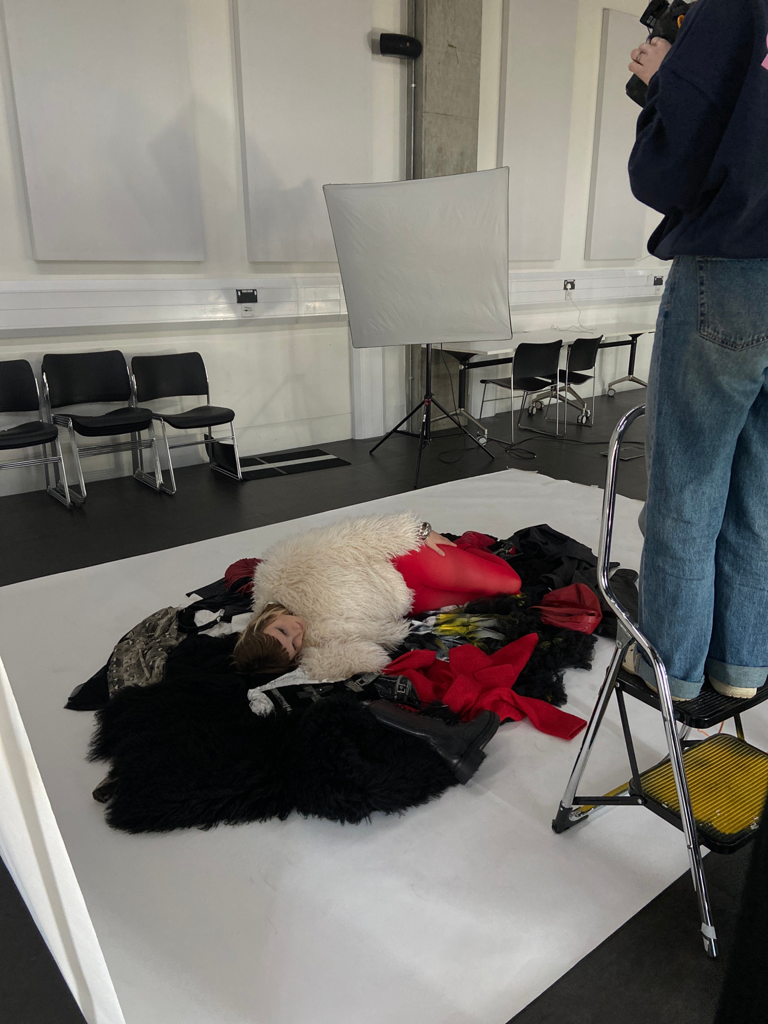 A photograph shows a person lying in a pile of clothes on a white surface. The person is wearing a white fur coat and red tights. There are also red, black, and camouflage clothes in the pile. A perso…read more