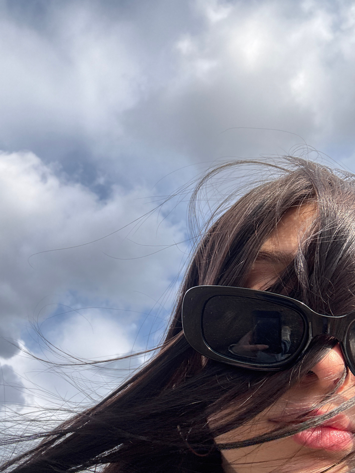 The image shows a person with long, dark hair and sunglasses, likely female, looking upwards towards a cloudy sky. The person is not fully visible, focusing on the area around the eyes, lips, and part…read more