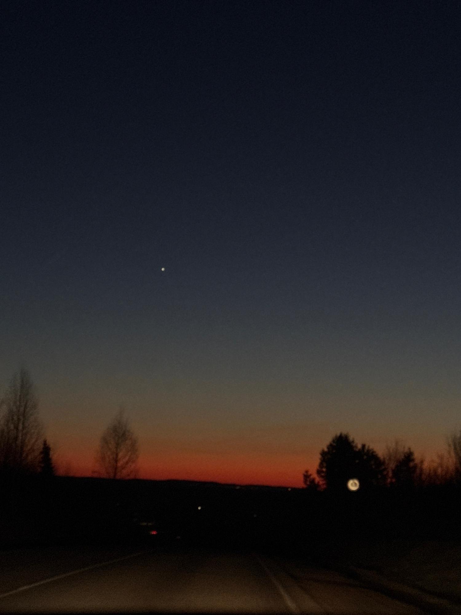 The image depicts a dark, partially illuminated scene likely taken during twilight. The sky transitions from deep blue on the left to orange/red on the right horizon, suggesting a sunrise or sunset. A single, small bright dot is visible in the sky, possibly a star or planet. Silhouetted trees line the horizon. On the right edge of the frame, a dark, undefined object is present, obscuring part of the view and suggesting a nearby surface, potentially the inside of a vehicle. There is a small, blurred light in the horizon. The image's location is speculated to be Garevaya, Russia. | Open Wire