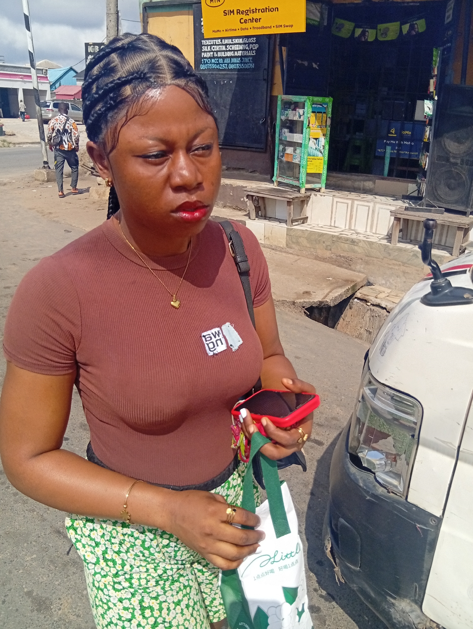 A medium shot captures a woman standing on a city street. She is wearing a brown t-shirt, a gold necklace with a heart pendant, a gold bracelet, and a green floral skirt. She holds a red smartphone an…read more