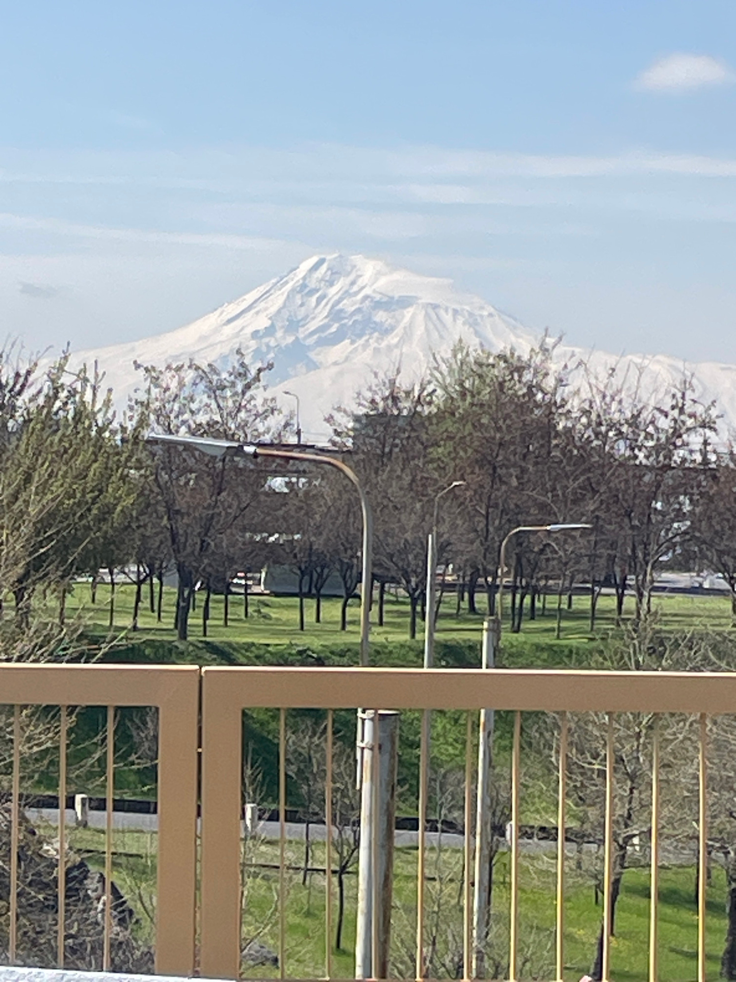 The image shows a snow-capped mountain, possibly Mount Ararat, visible in the distance. The foreground includes trees, a grassy area, and a fence or railing, suggesting the view is from a balcony or e…read more