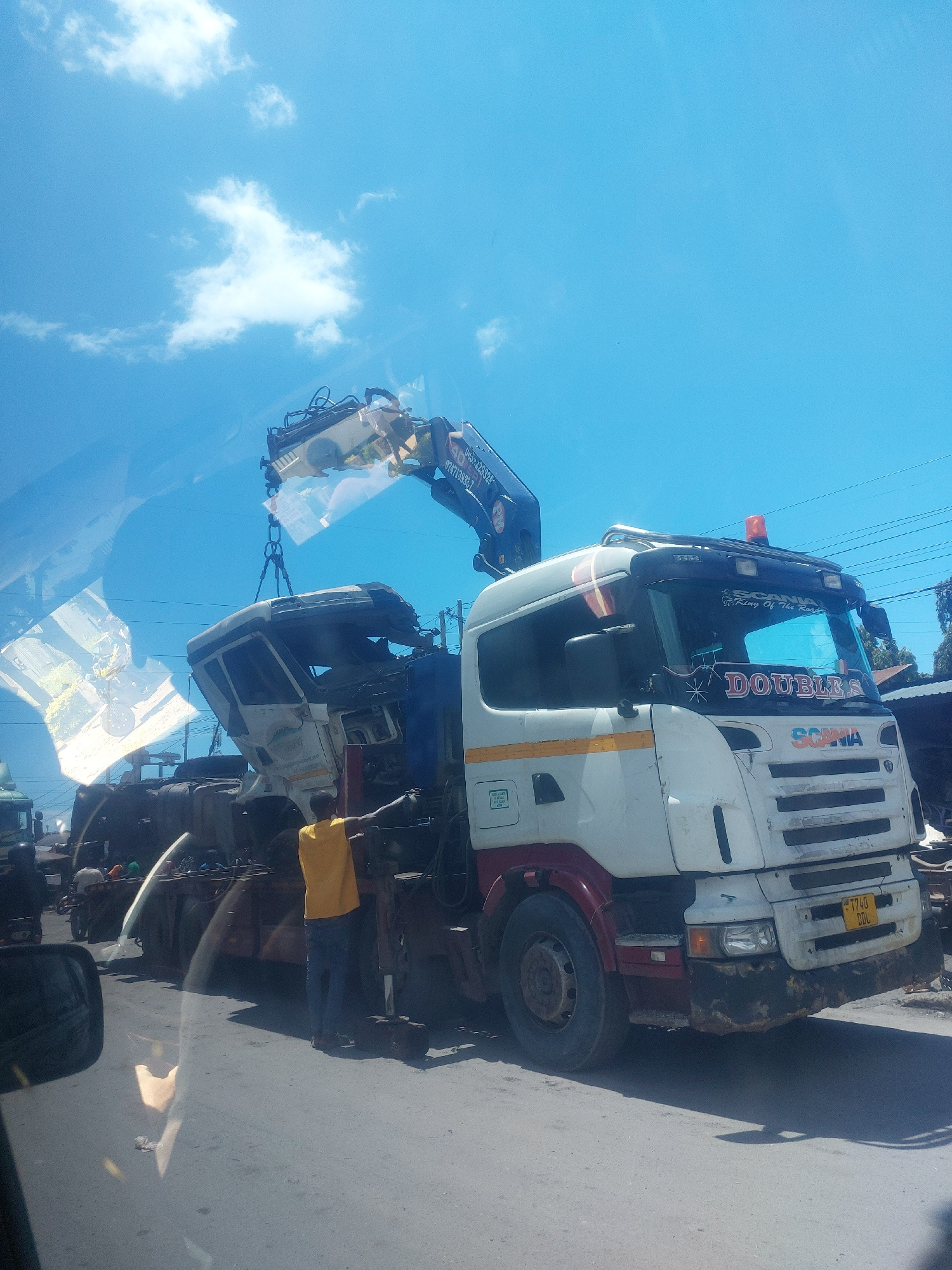 The image, viewed upright, depicts an outdoor scene under a bright, clear blue sky with scattered white clouds. The primary subject is a large white and maroon Scania truck, equipped with a crane, par…read more