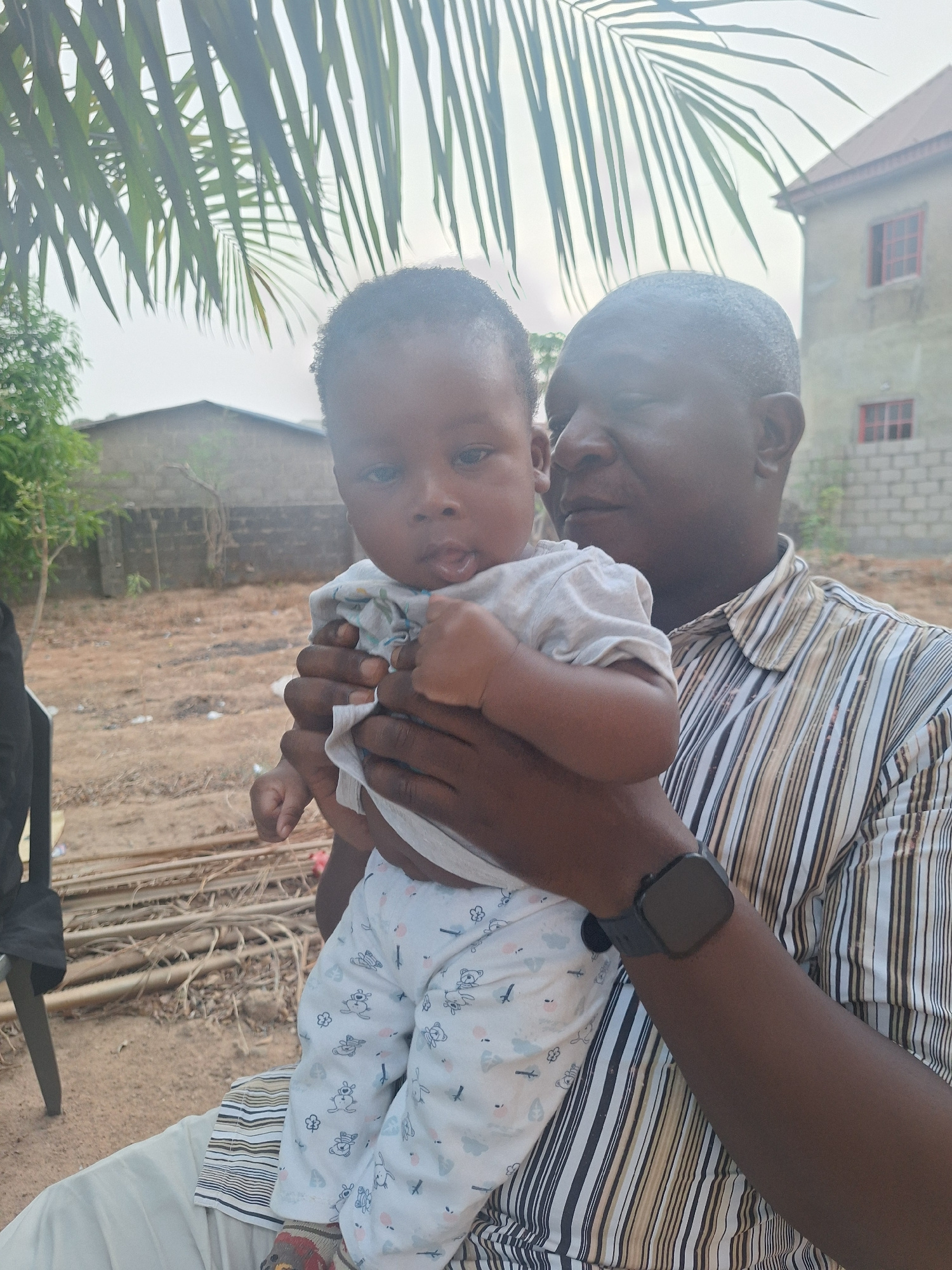 A medium shot captures a man holding a baby outdoors. The man has dark skin and is wearing a striped shirt and a black smartwatch. The baby, dressed in patterned clothing, faces forward. The backgroun…read more