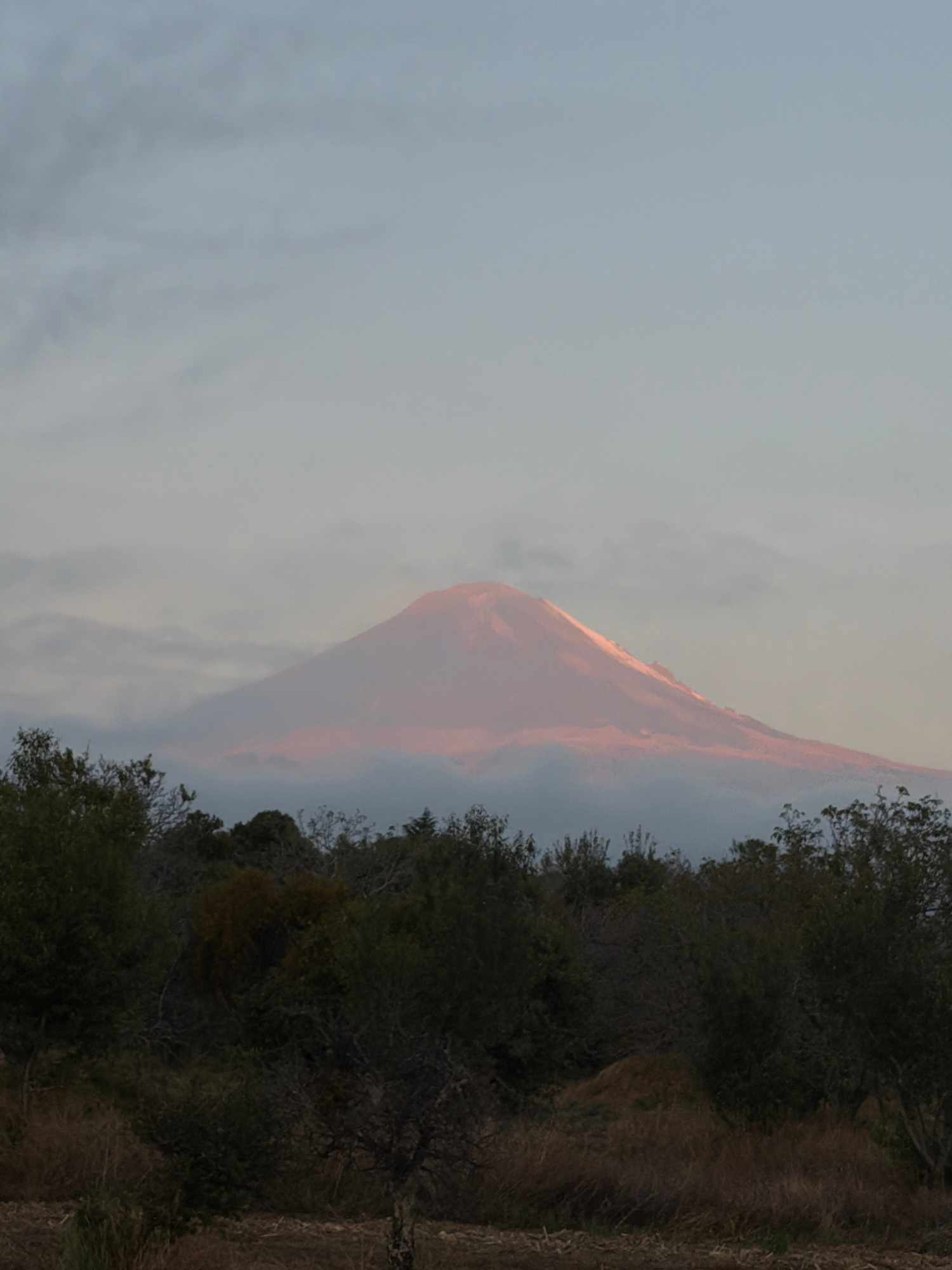 The image presents a landscape in San Nicolás de Los Ranchos, Mexico. A mountain, possibly Popocatépetl, is visible through a layer of haze or smog, its upper portion illuminated with a warm, orange…read more
