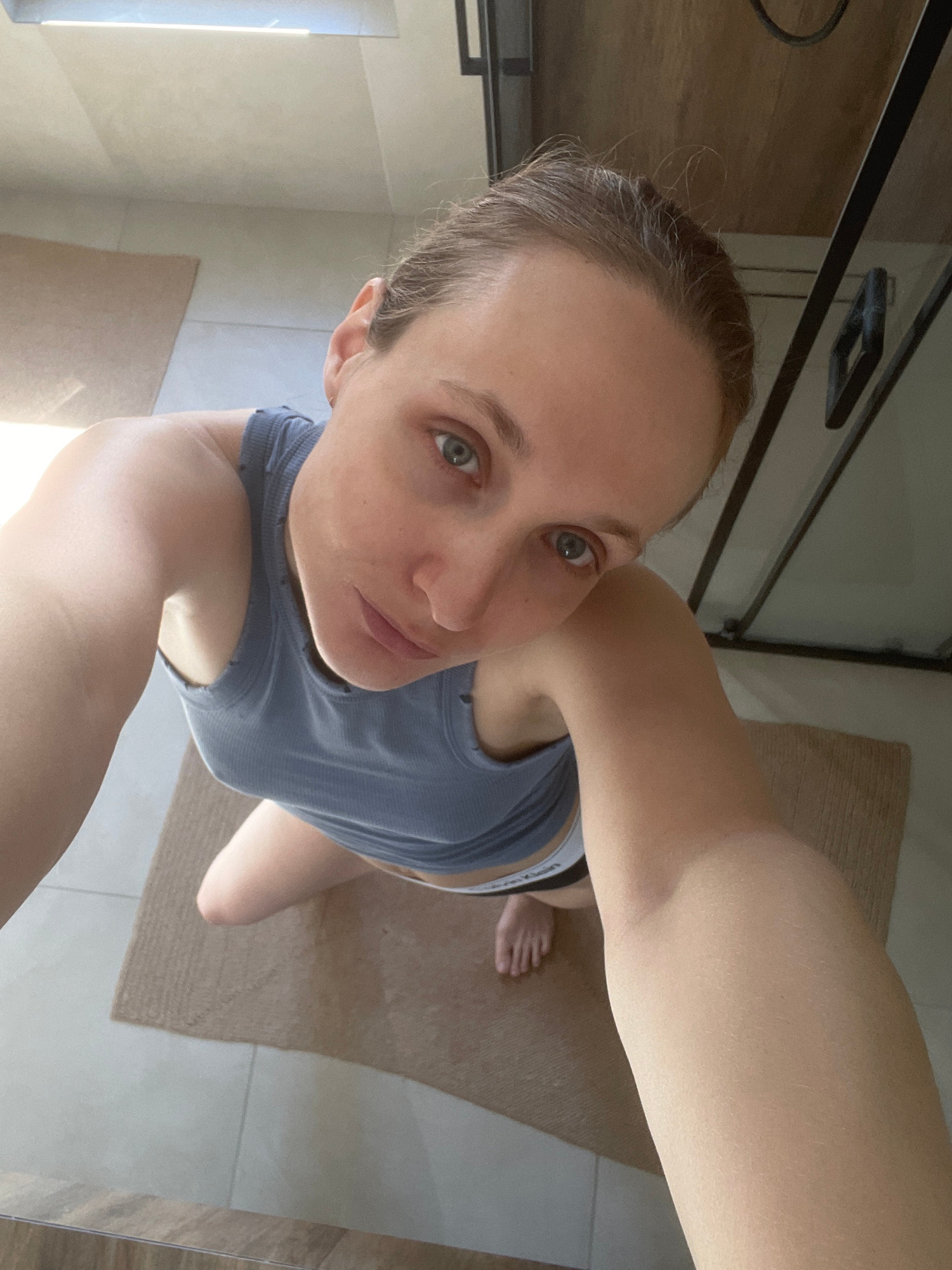 The image is a selfie taken by a woman with short brown hair and light eyes. She is wearing a gray tank top and appears to be in a bathroom, as evidenced by the tiled floor and a rug. A bed frame is p…read more