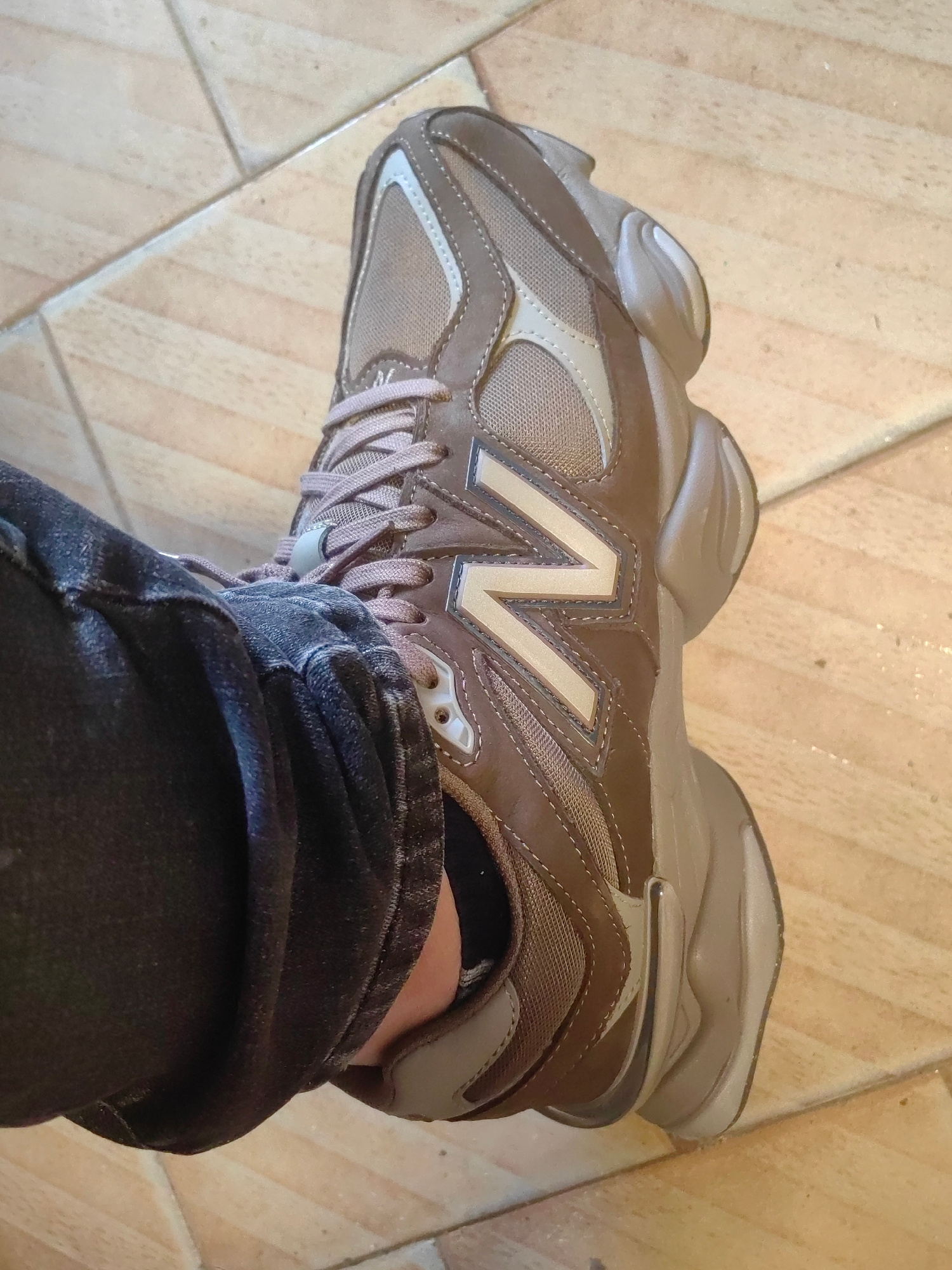 The image shows a person wearing a brown and beige New Balance 9060 sneaker on a light brown tiled floor. The person is wearing dark-colored jeans. No specific location details relating to Gorna Oryah…read more
