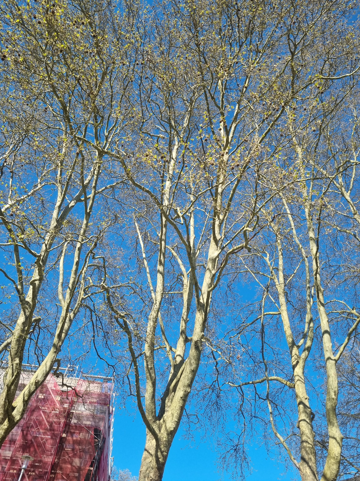 Looking upwards through the bare branches of a tree against a clear blue sky. Some branches bear small buds or leaves. A building covered in red scaffolding is visible in the lower right corner. The i…read more