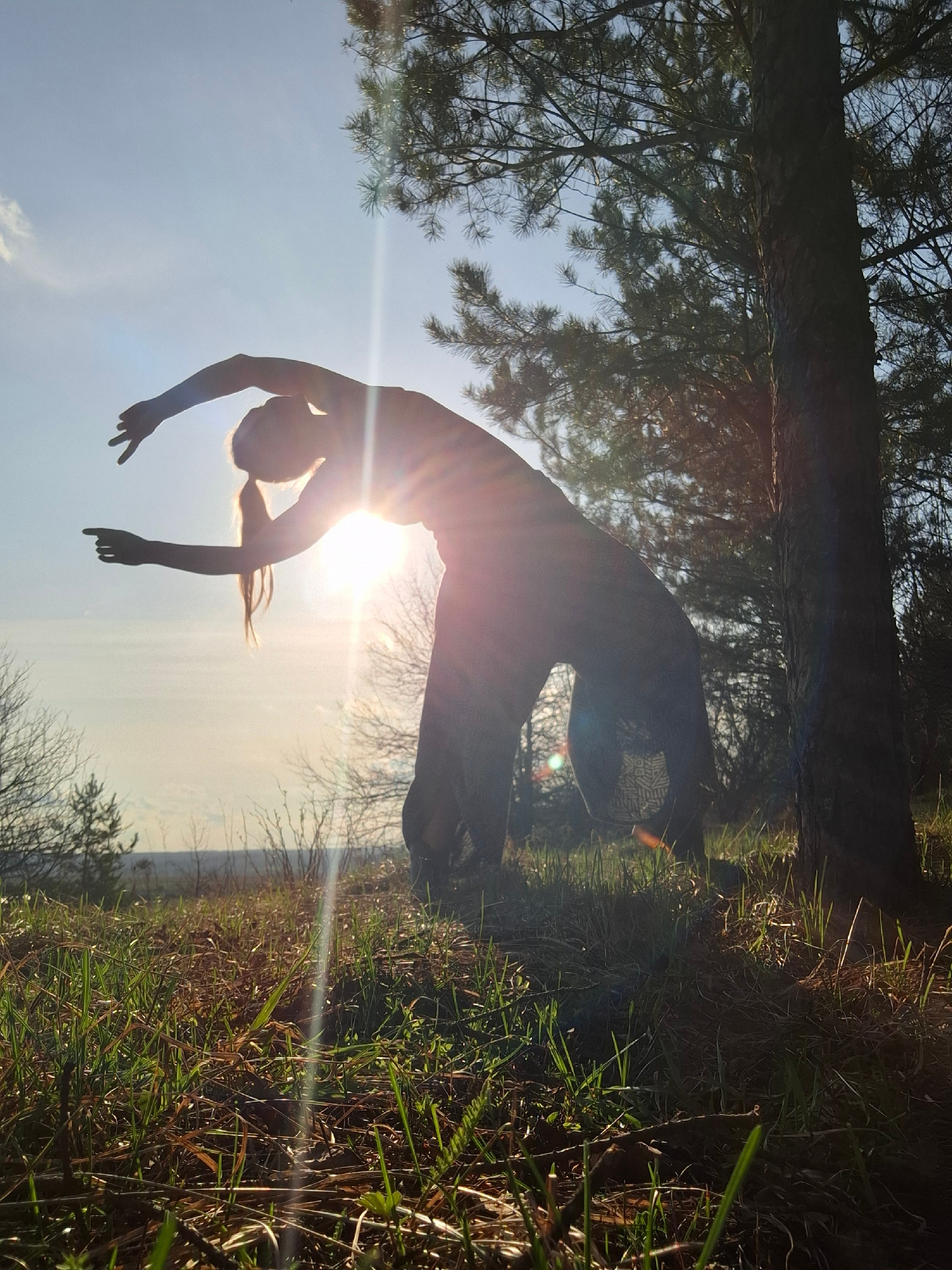 This media file captures an outdoor scene in Khlevnoye, Russia, featuring a person performing an athletic pose against a bright, sunlit sky. The image is currently rotated 90 degrees clockwise. **Sub…read more