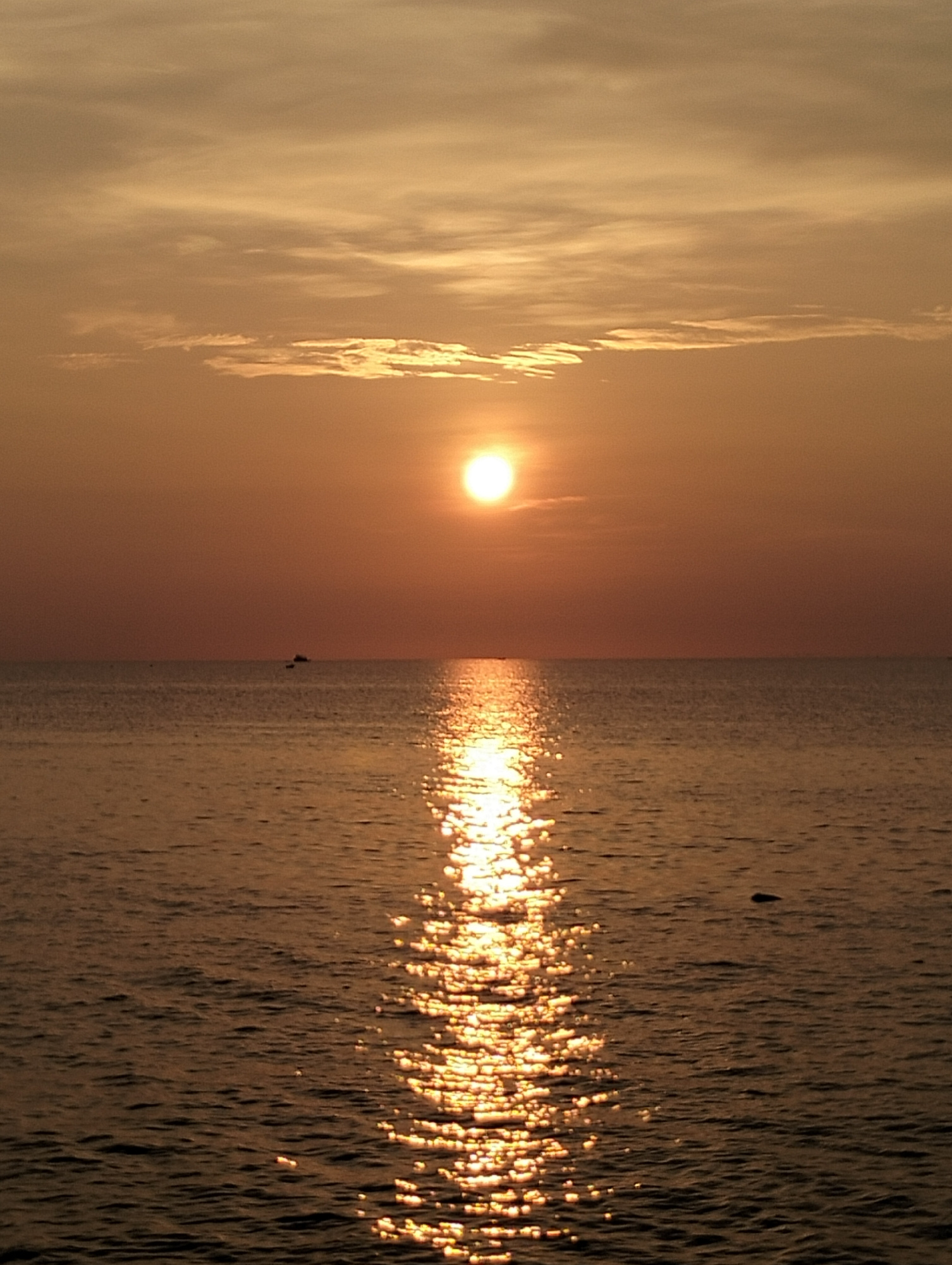 The image shows a sunset over the ocean, likely taken from a location in Lhokseumawe, Indonesia. The sun is positioned high in the sky, obscured by thin clouds. The ocean surface reflects the sunlight…read more