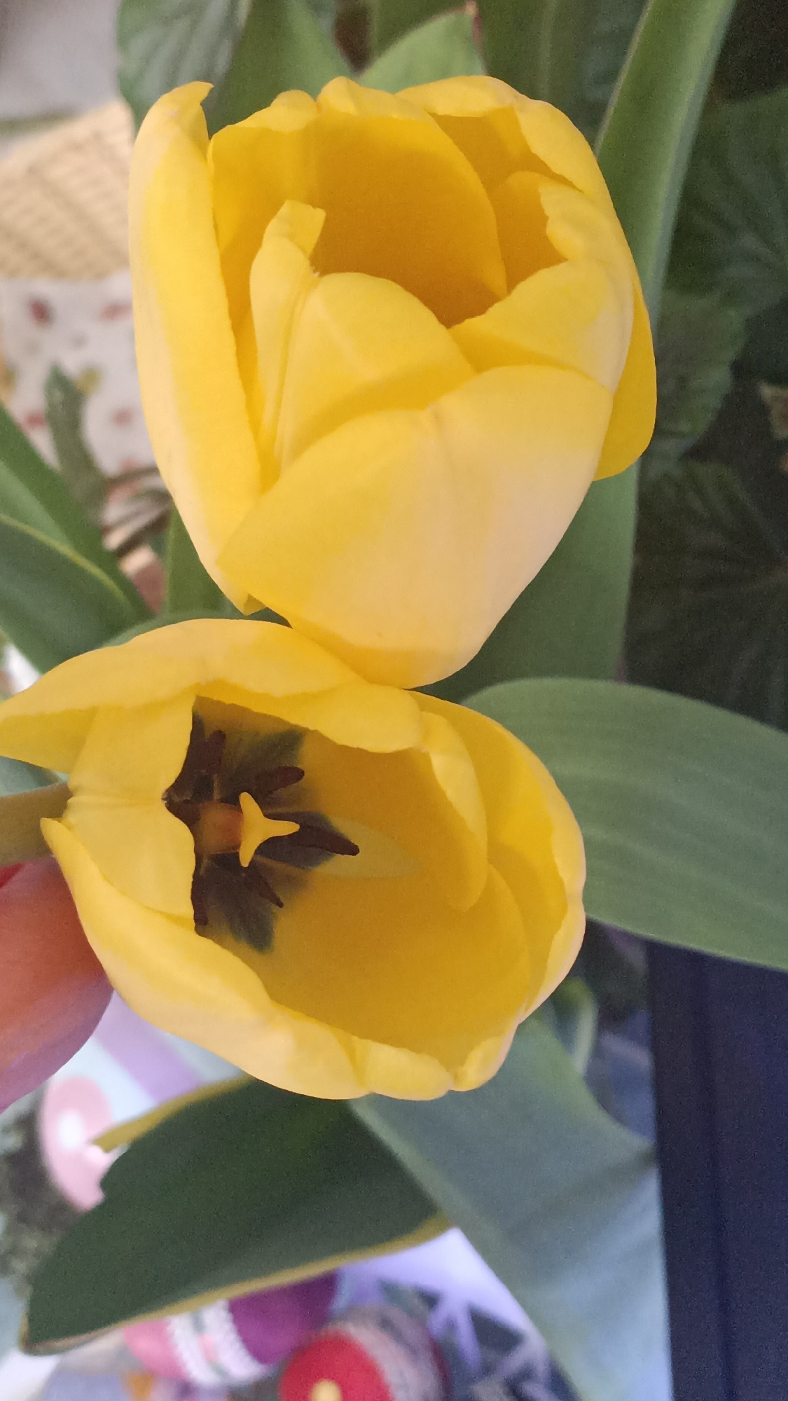 Two yellow tulips, one closed and one open, are positioned above a blurred background of green leaves and decorative objects. The open tulip reveals a dark center with a yellow pistil. The background…read more