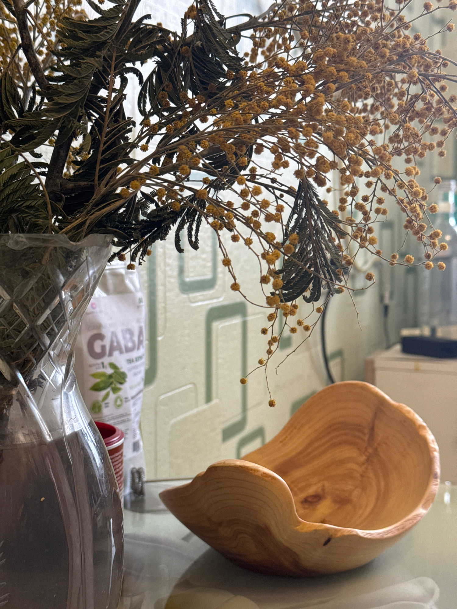 The image shows a still life arrangement on a table in what appears to be an indoor setting. A dried floral arrangement, including yellow pom-pom-like flowers and dark green fern-like foliage, is prom…read more