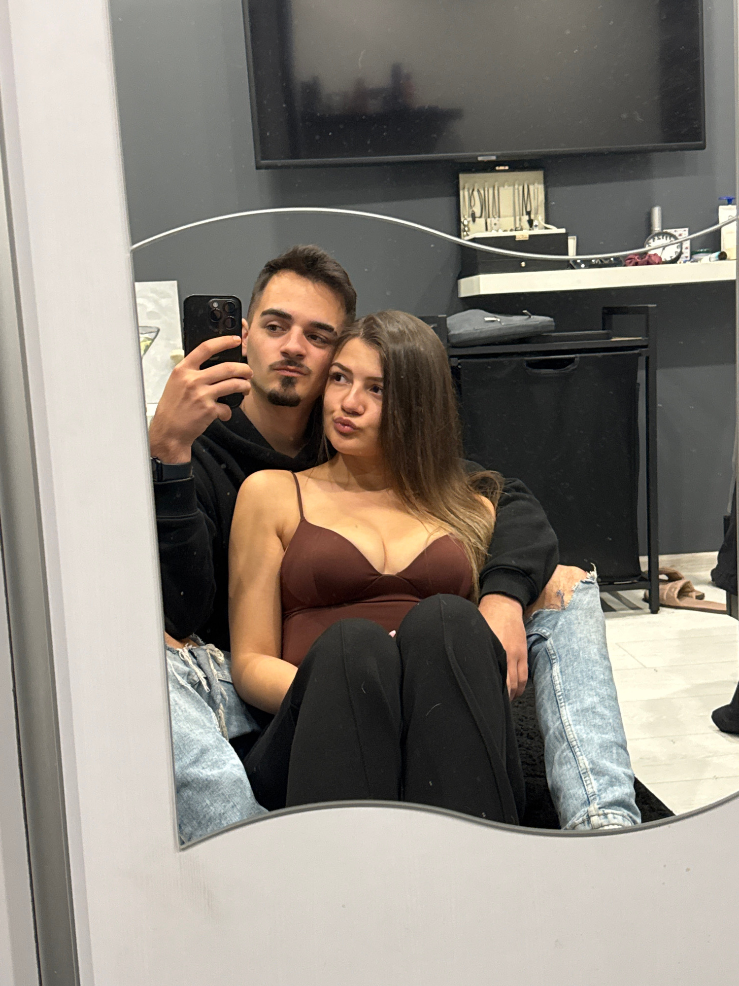 A mirror selfie captures a young couple posing in what appears to be an indoor setting. The image is taken from a reflection in a large, white-framed mirror. On the left side of the frame, a man withβ¦read more