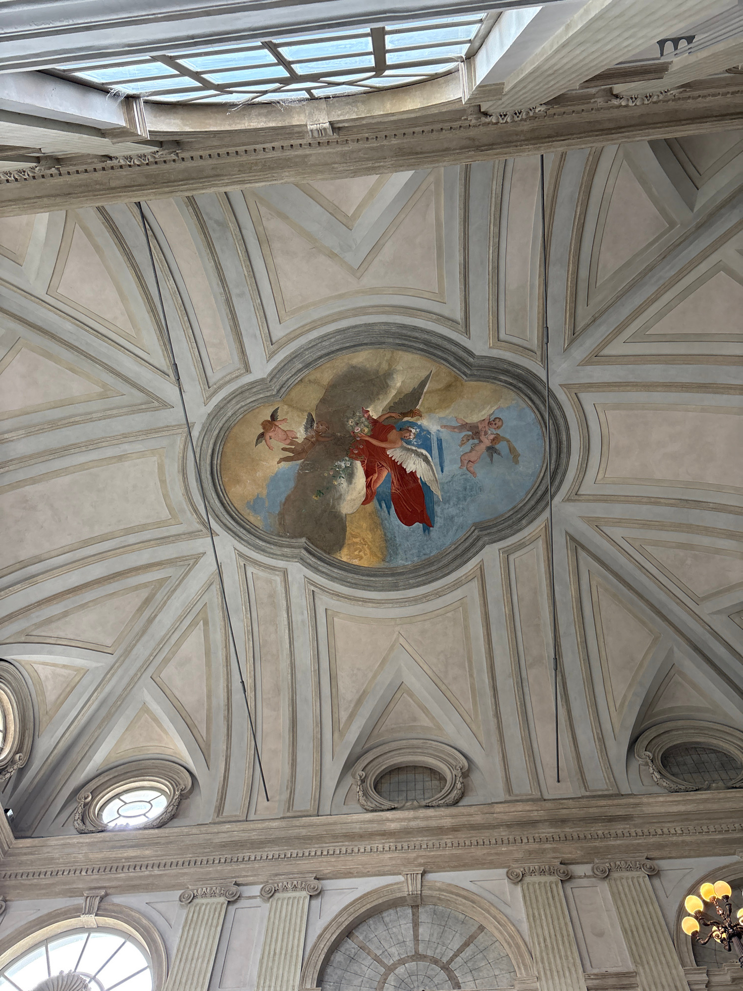 This image depicts the ceiling of a church in Milan, Italy. The ceiling is a dome with a central fresco depicting an allegorical scene with winged figures (angels or putti) and a seated figure in redβ¦read more