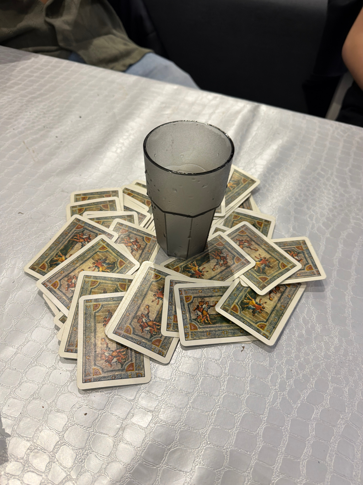 The image presents an overhead view of a frosted glass and numerous playing cards scattered across a textured white tablecloth. The scene is set indoors, contextually in Grad Rijeka, Croatia. The cen…read more