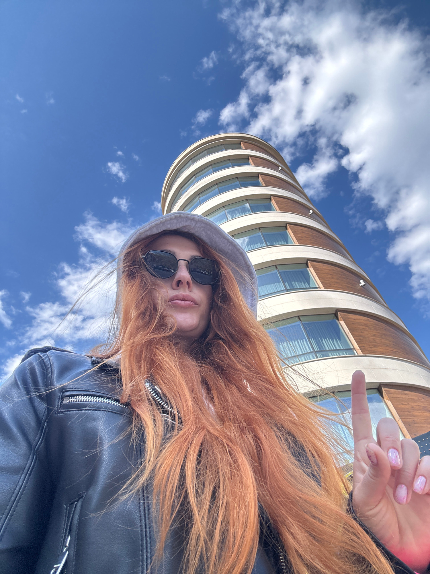 The image shows a woman standing in front of a building under a partly cloudy, bright blue sky. She is wearing a hooded sweatshirt, sunglasses, and a black leather jacket. Her hair is long and reddish…read more