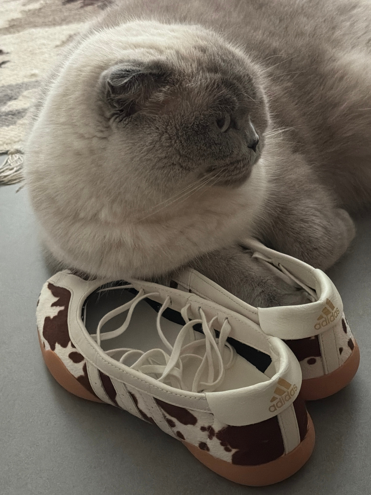 The image shows a gray cat resting its head on a pair of Adidas sneakers with a brown and white cow print design. The sneakers are placed on a gray surface. The environment and specific location in Te…read more