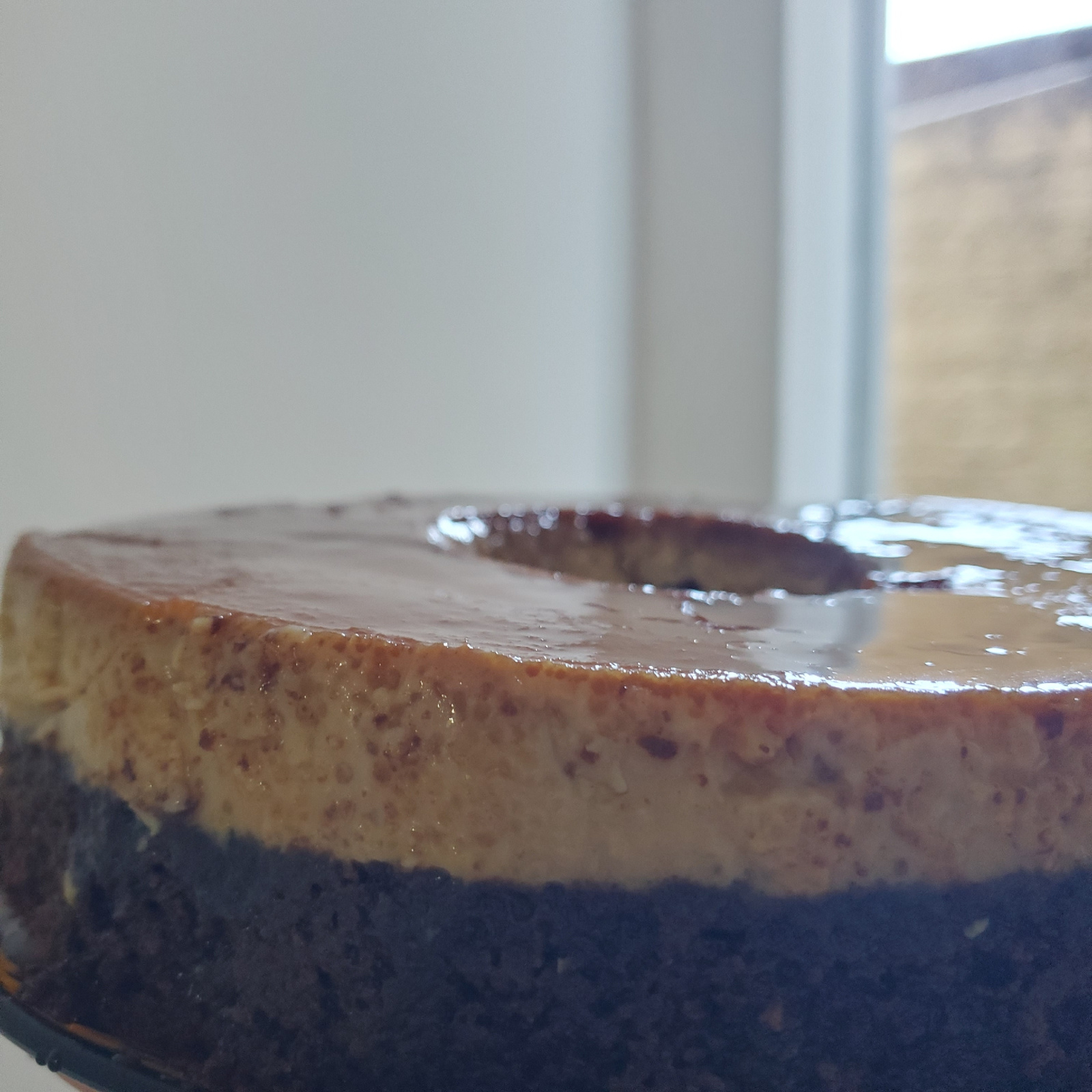 A close-up photograph shows a slice of cake with multiple layers. A caramel layer is visible, along with a darker, likely chocolate layer. The cake appears to be gelatinous. Light is reflecting off th…read more