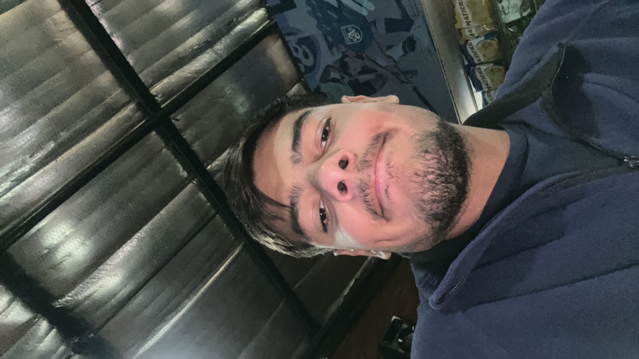The image shows three men sitting on a bench under a metal roofed structure. The foreground figure wears a brown t-shirt and blue jeans and a dark green baseball cap. The middle figure wears a dark bl…read more