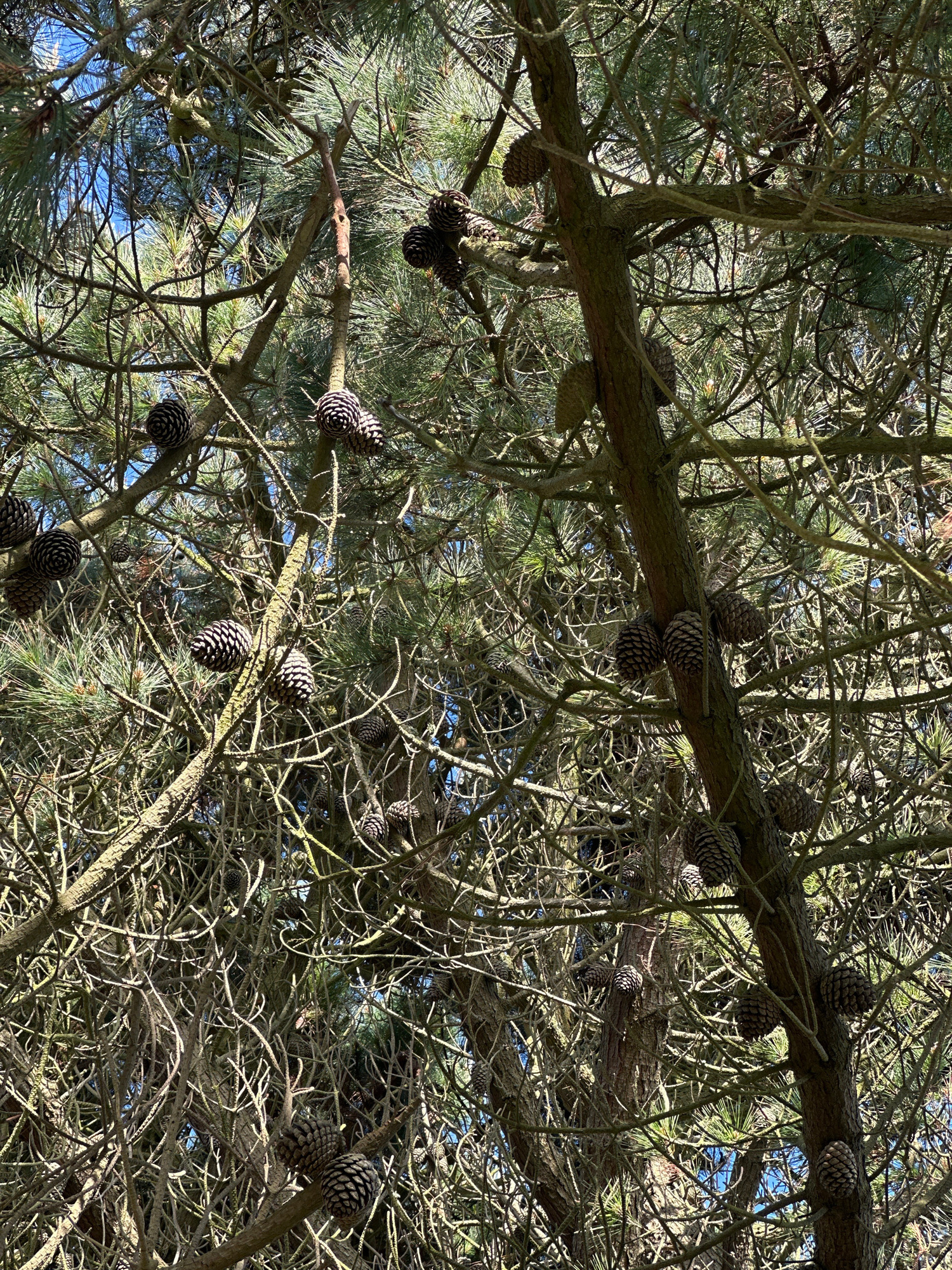 The image shows a close-up, upward view into the dense branches of a pine tree heavily laden with pine cones. The branches are mostly bare, suggesting it could be winter or early spring. There are sev…read more