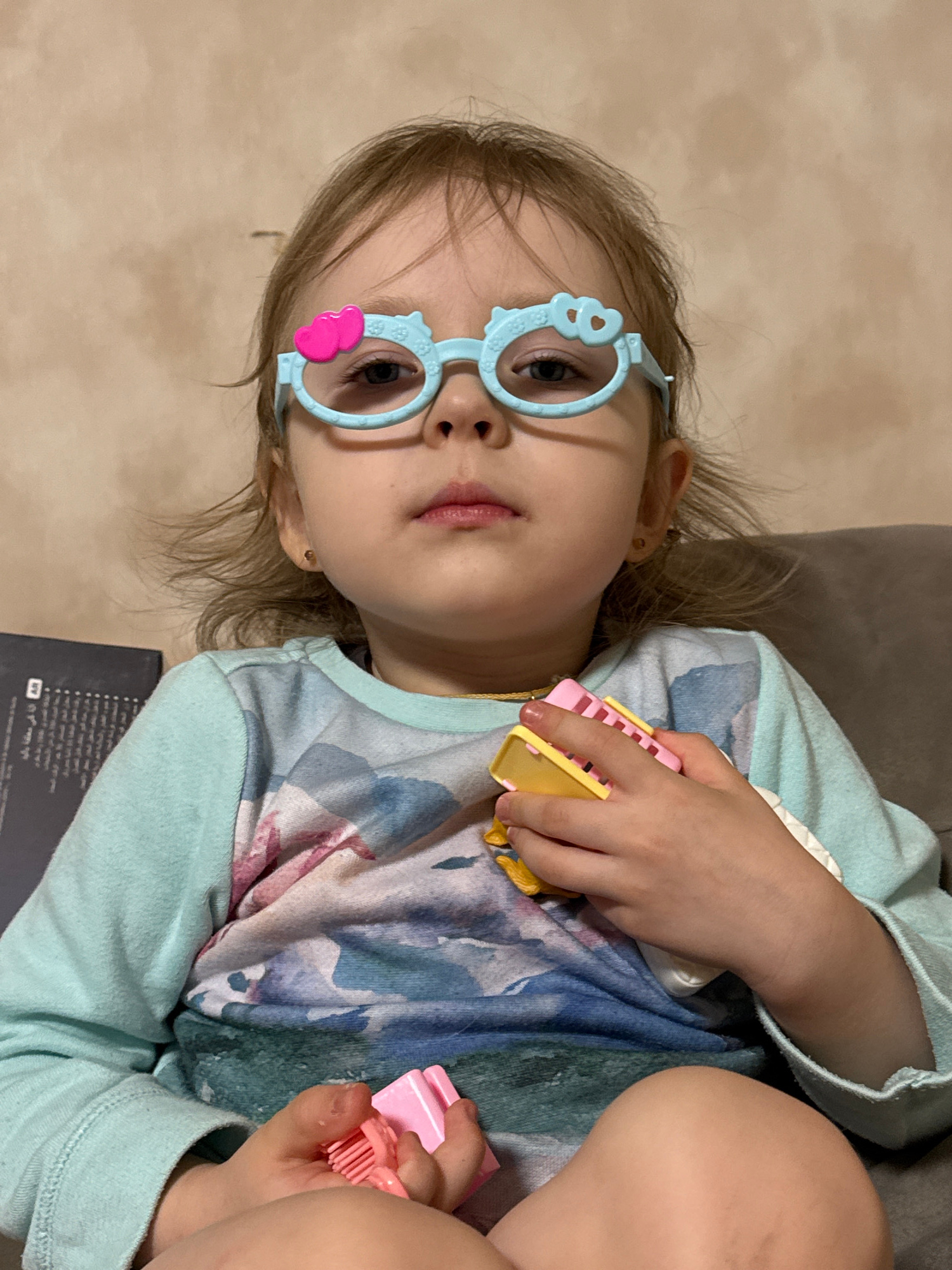 A young girl lies on a tan upholstered surface. She is wearing light blue glasses with heart and animal details. Her long hair is light brown. She is wearing a light blue shirt with a watercolor-like…read more