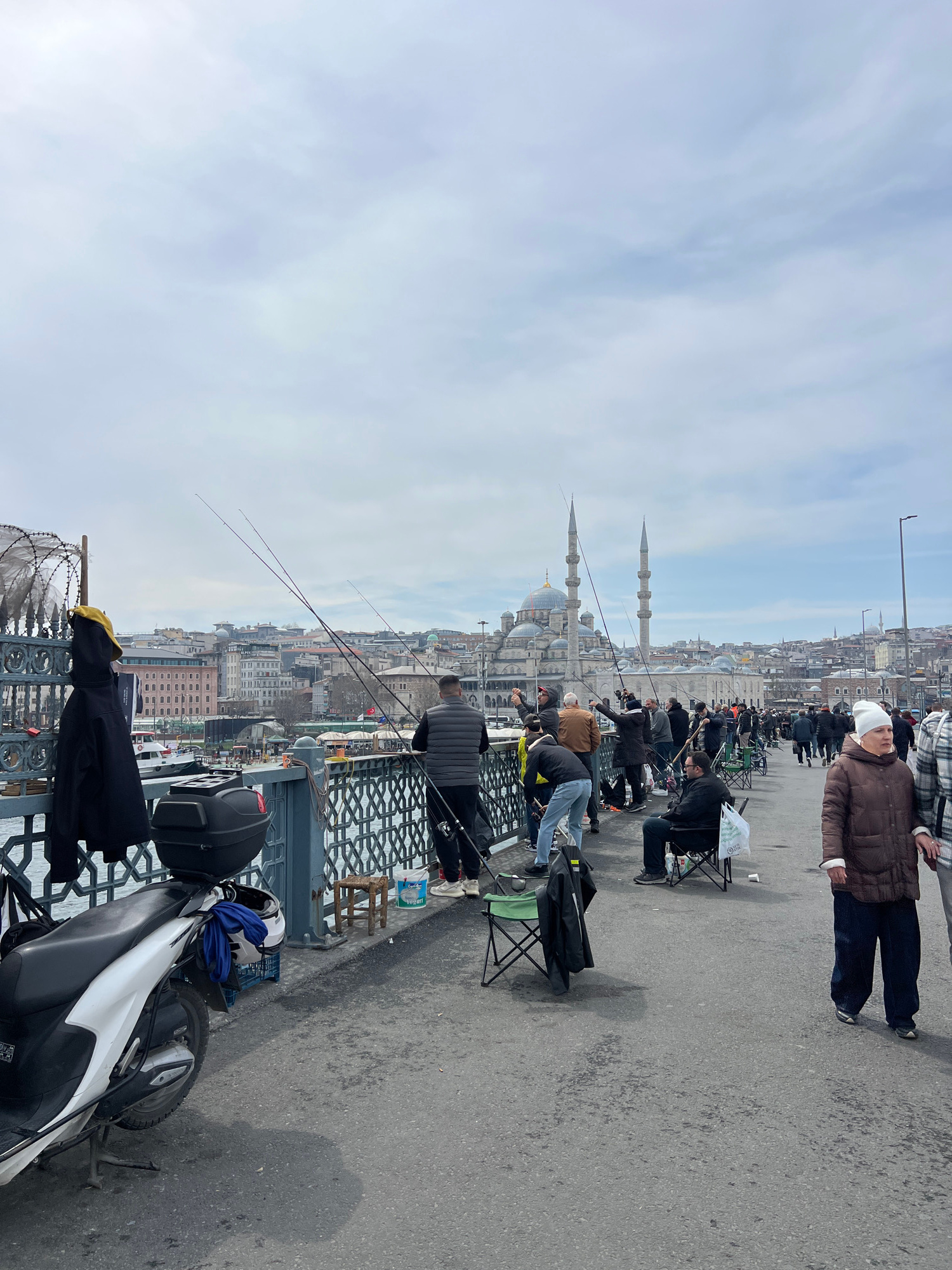 The image shows a group of people fishing from a bridge in Beyoğlu, Turkey. They are standing and sitting along the bridge railing, holding fishing rods that extend over the water. In the background,…read more