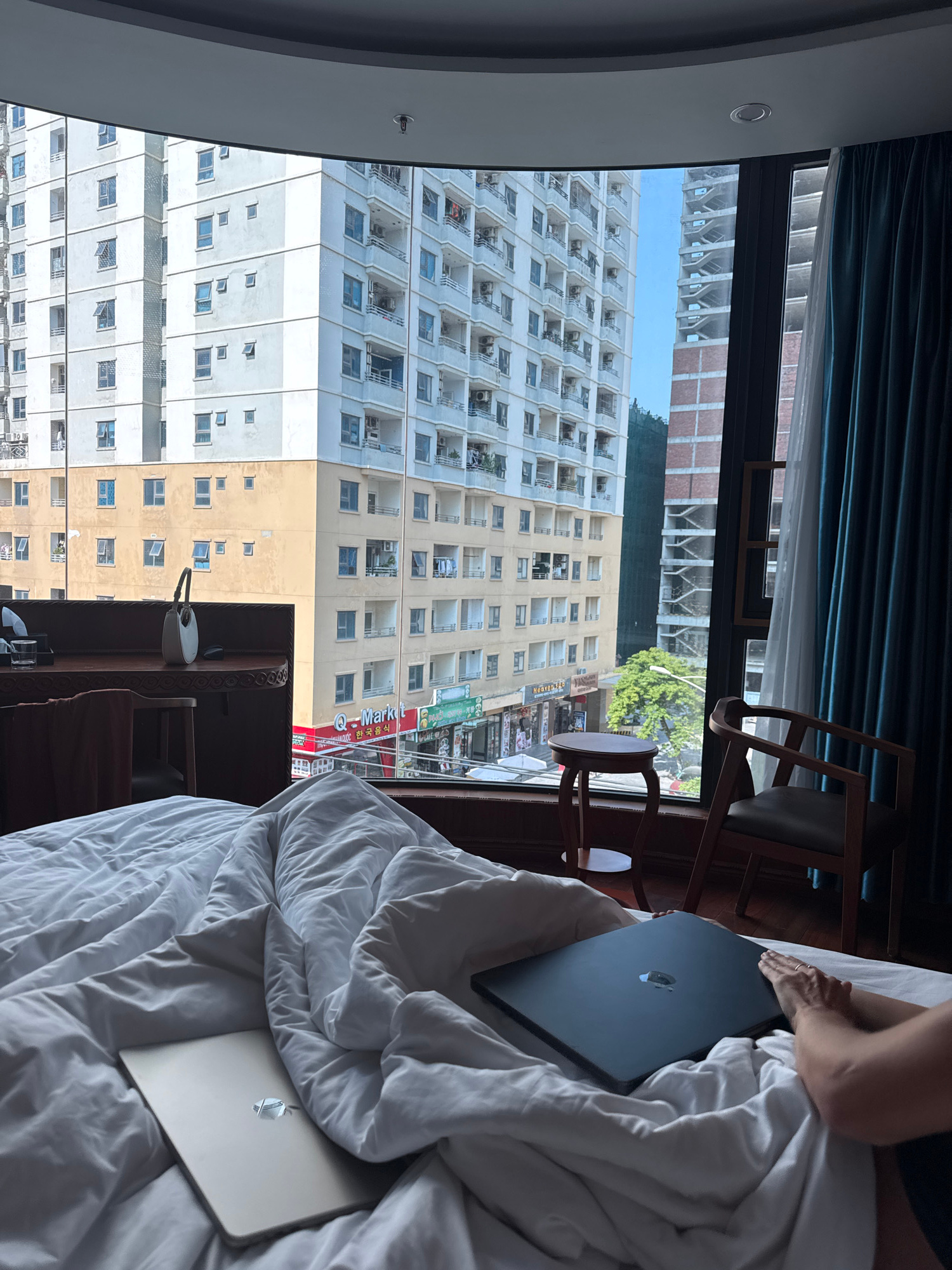 The image shows an interior view from a room, likely a hotel, overlooking a cityscape. The room has a large window with dark teal curtains, offering a view of several multi-story buildings across the…read more