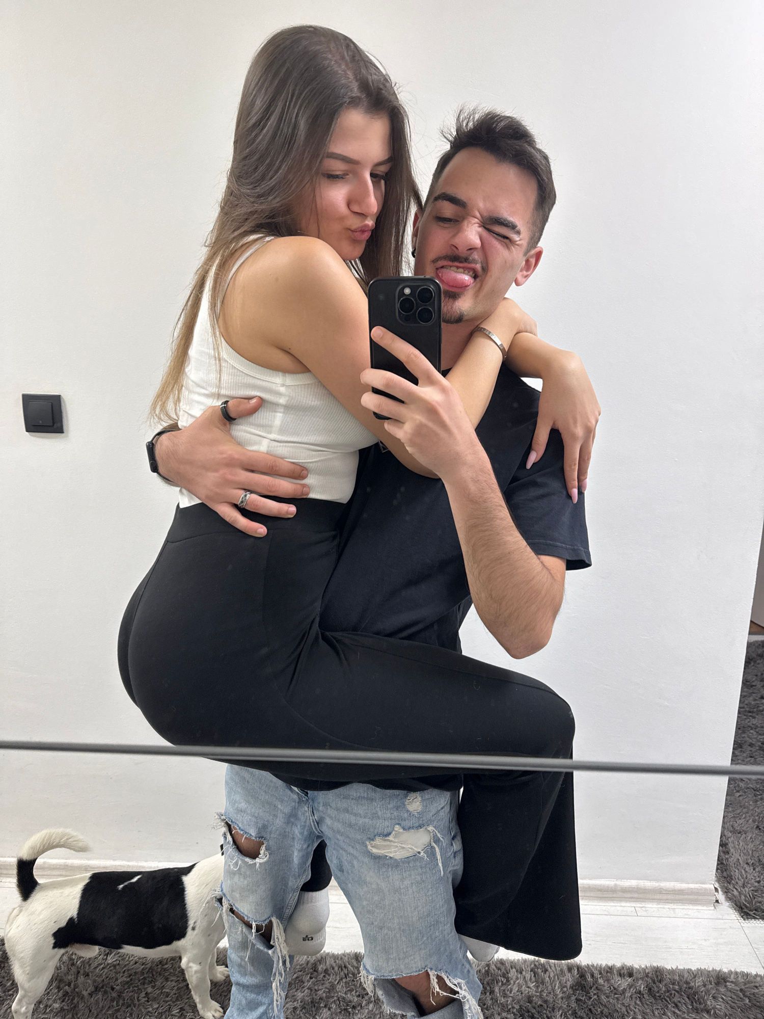 A man and a woman are photographed in a mirror. The man is wearing a black t-shirt and black pants and the woman is wearing a white tank top and black pants. The man is sticking his tongue out. The wo…read more