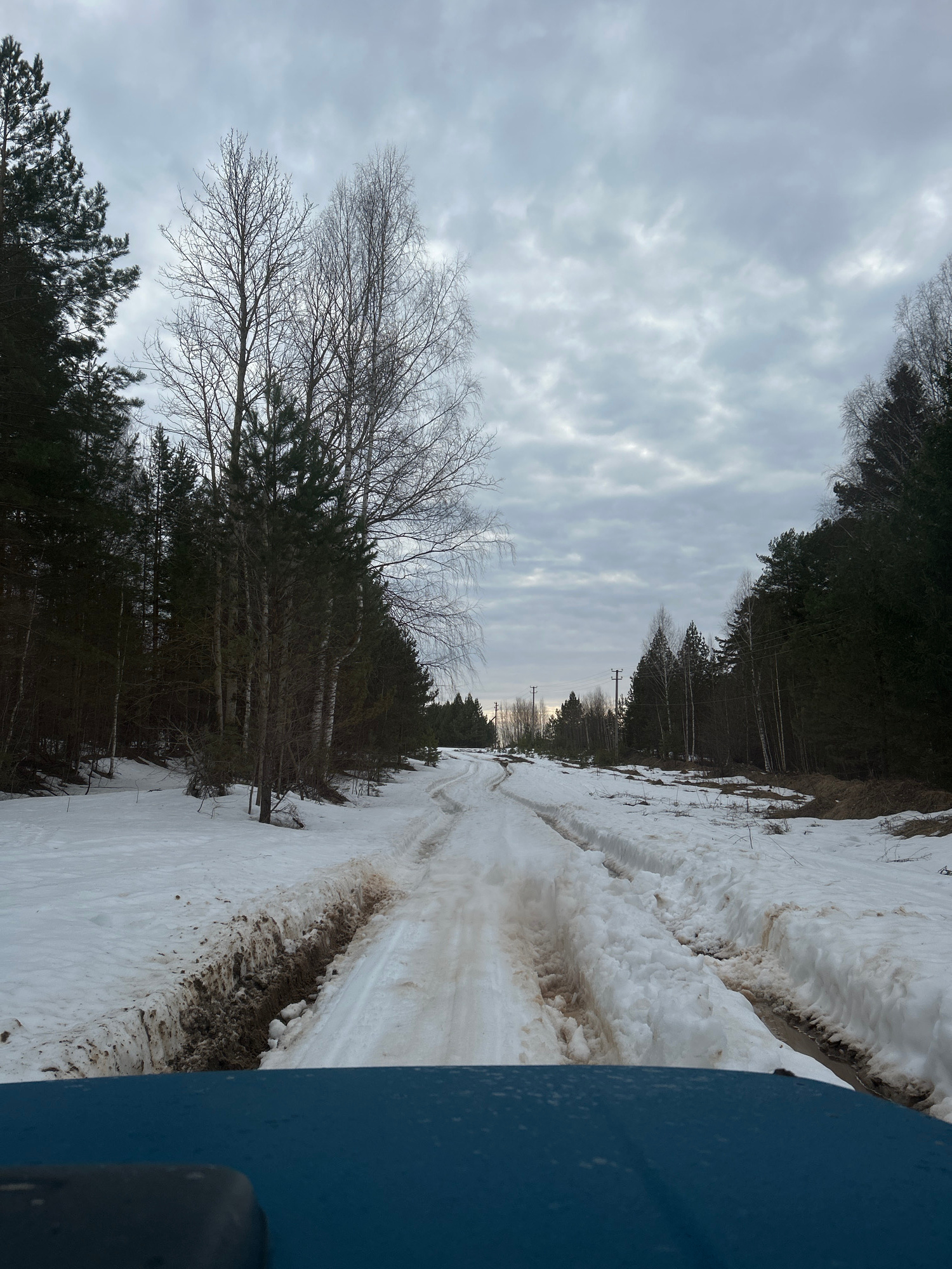 The image depicts a snowy, rural road surrounded by dense trees under an overcast sky. The location is identified as Уральское, Russia. The road appears to be partially cleared, with piles of dirty sn…read more