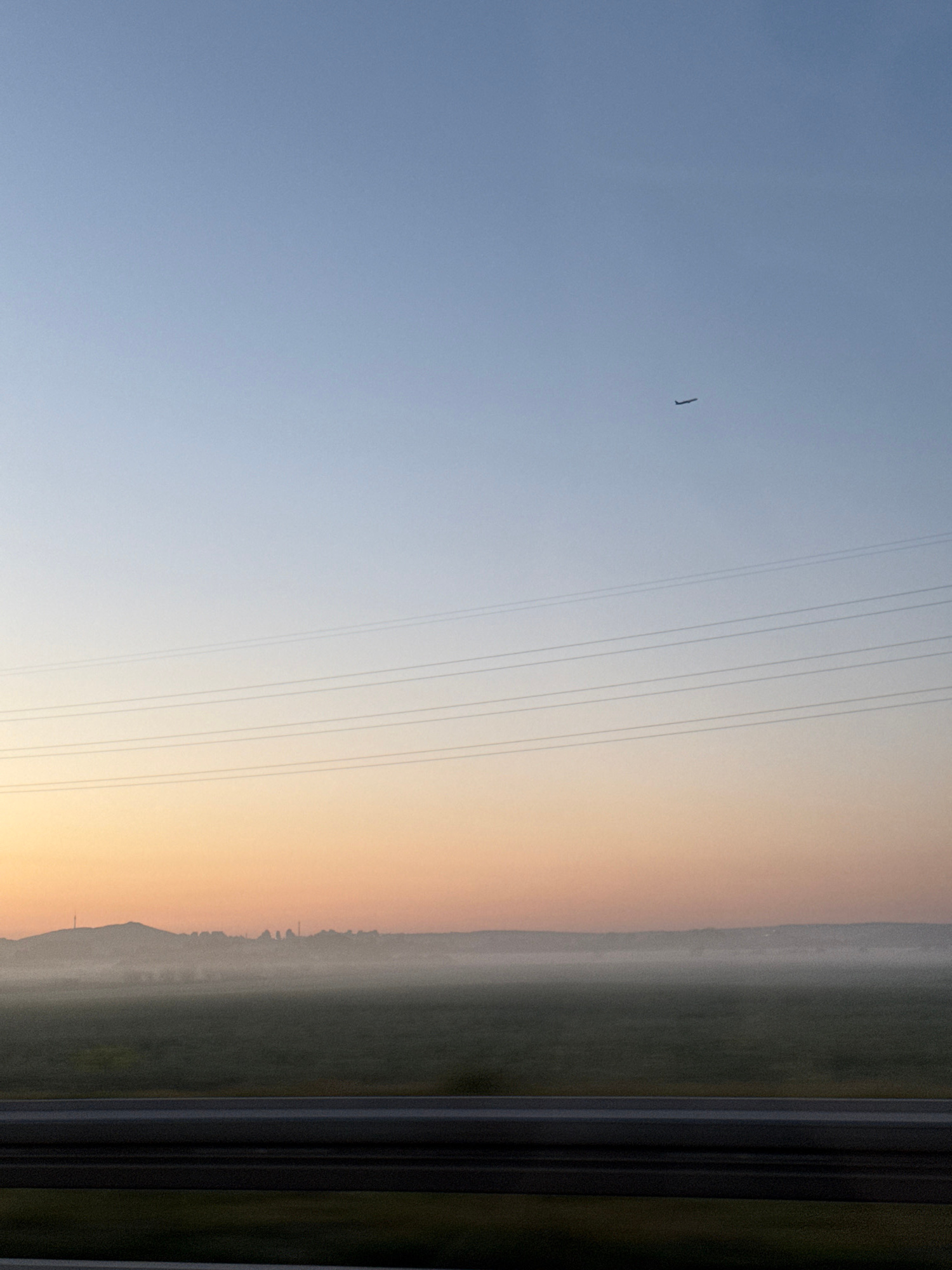 The image depicts a rural landscape transitioning from sky to land. A clear blue sky on the left gradually fades to a warm, orange hue near the horizon. Power lines stretch across the sky. Below the h…read more