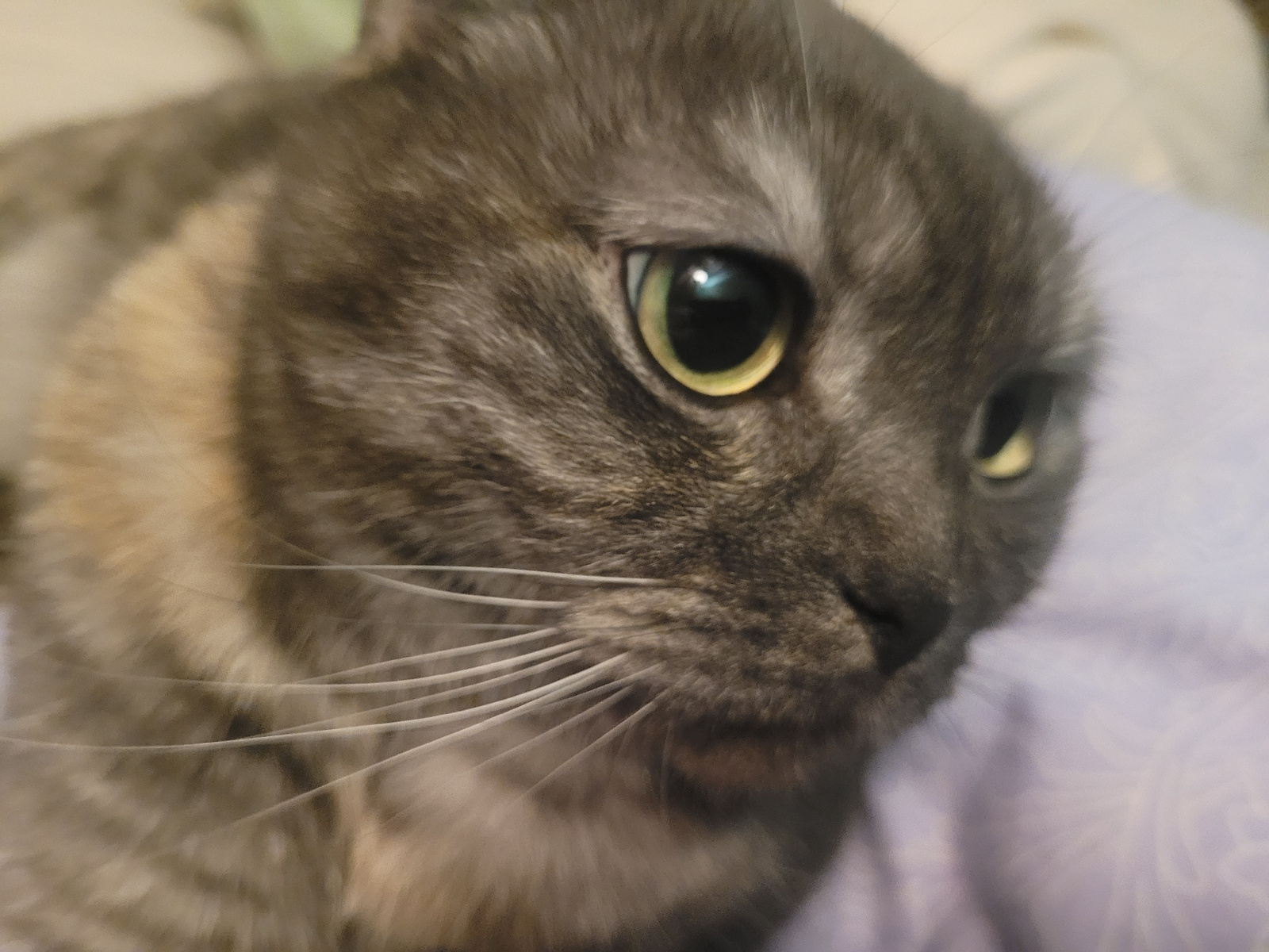 A close-up shot focuses on a gray and tan cat's face. The cat's eyes are a striking yellow-green. The whiskers are white and prominent. The background includes blurred purple fabric. There is no indic…read more