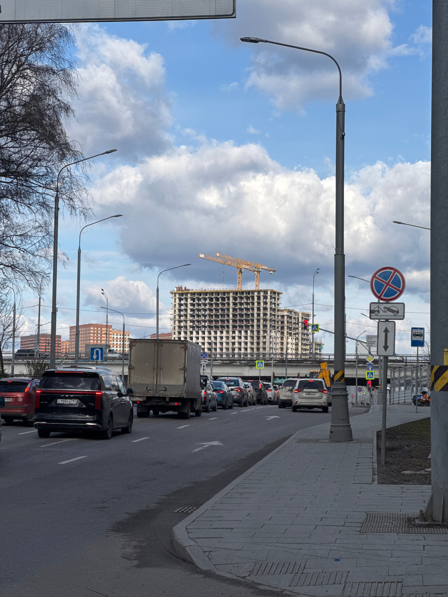 The image depicts a street scene in Moscow, Russia, showing a traffic jam on a road lined with sidewalks and various street furniture. The sky is partially cloudy. A tall building under construction w…read more
