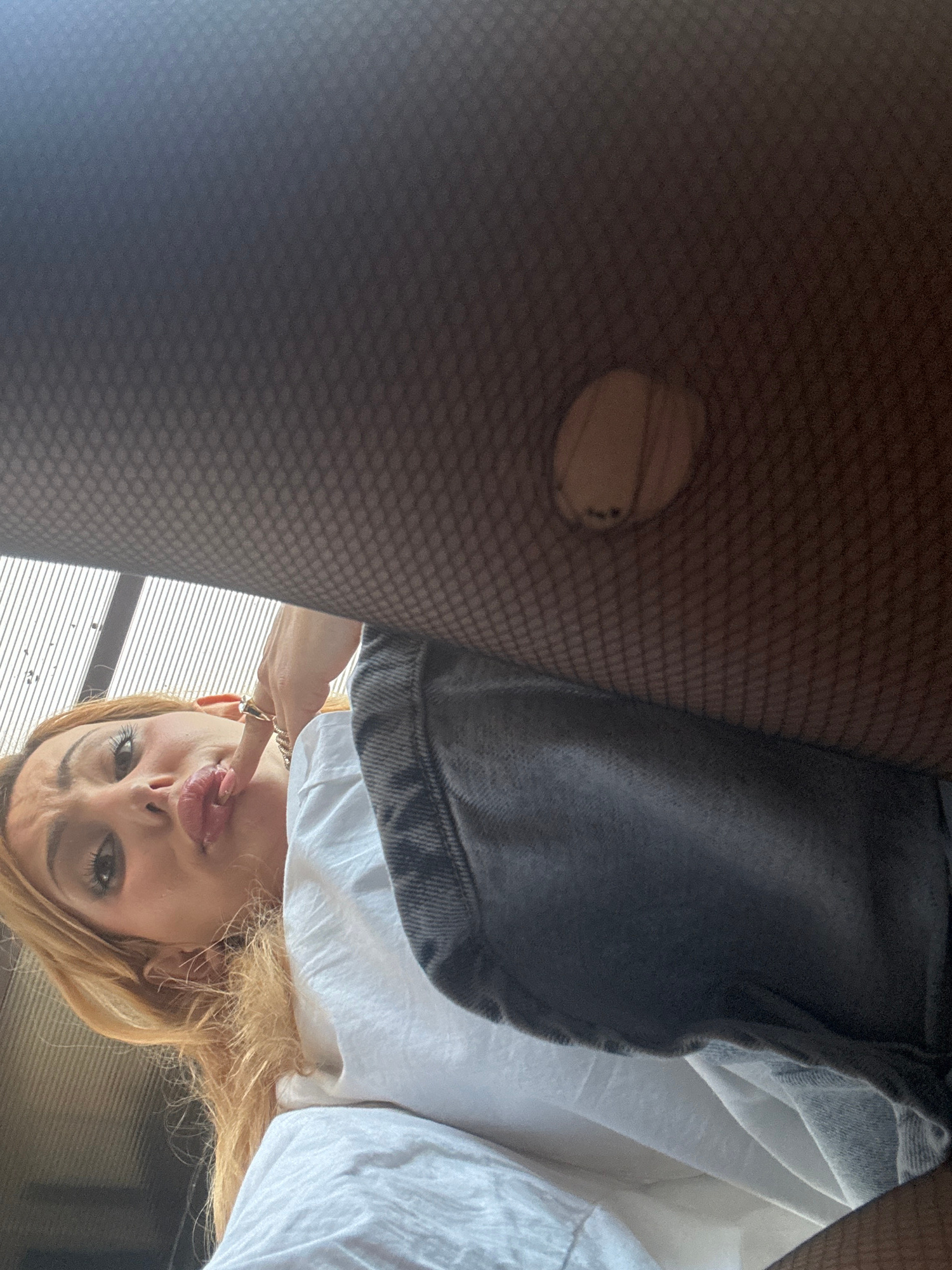 The image is a low-angle shot looking up at a woman. She has blonde hair, and is wearing a white shirt and grey denim shorts. She appears to be touching her lips with her index finger, which has a rinβ¦read more