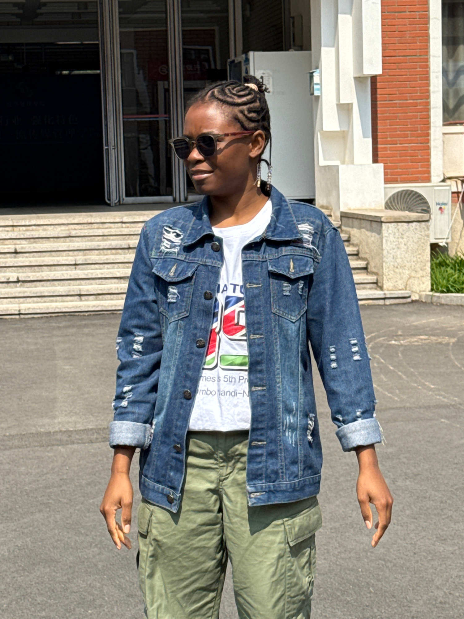 A young woman with braided hair and sunglasses stands outside a building in what appears to be an urban setting. She is wearing a white t-shirt with a colorful graphic, a distressed denim jacket, and…read more