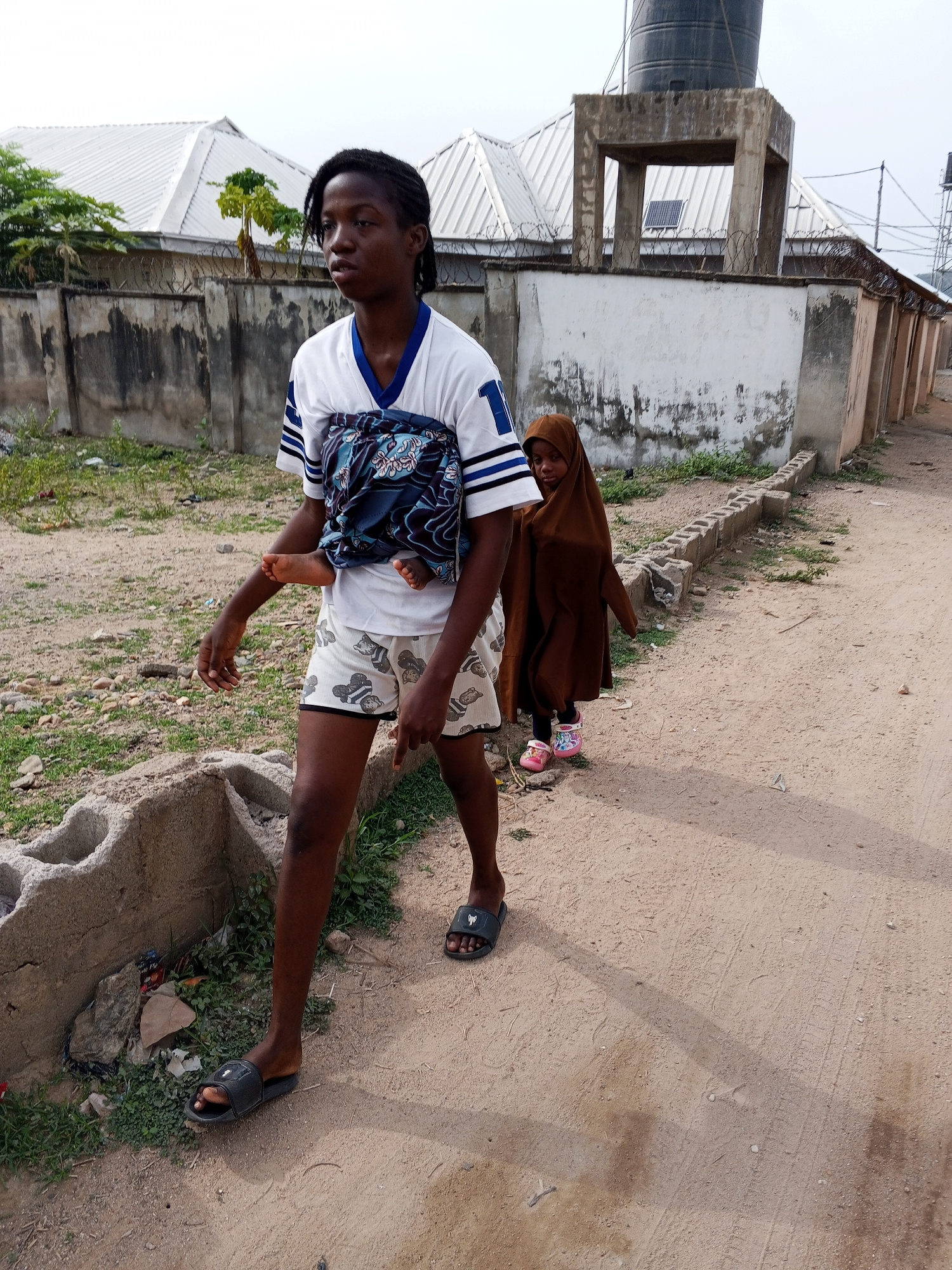 The image depicts an outdoor scene in Adonkolo, Nigeria, featuring two individuals walking along a dirt path. In the foreground and midground, a young person with dark skin and braided hair walks fro…read more
