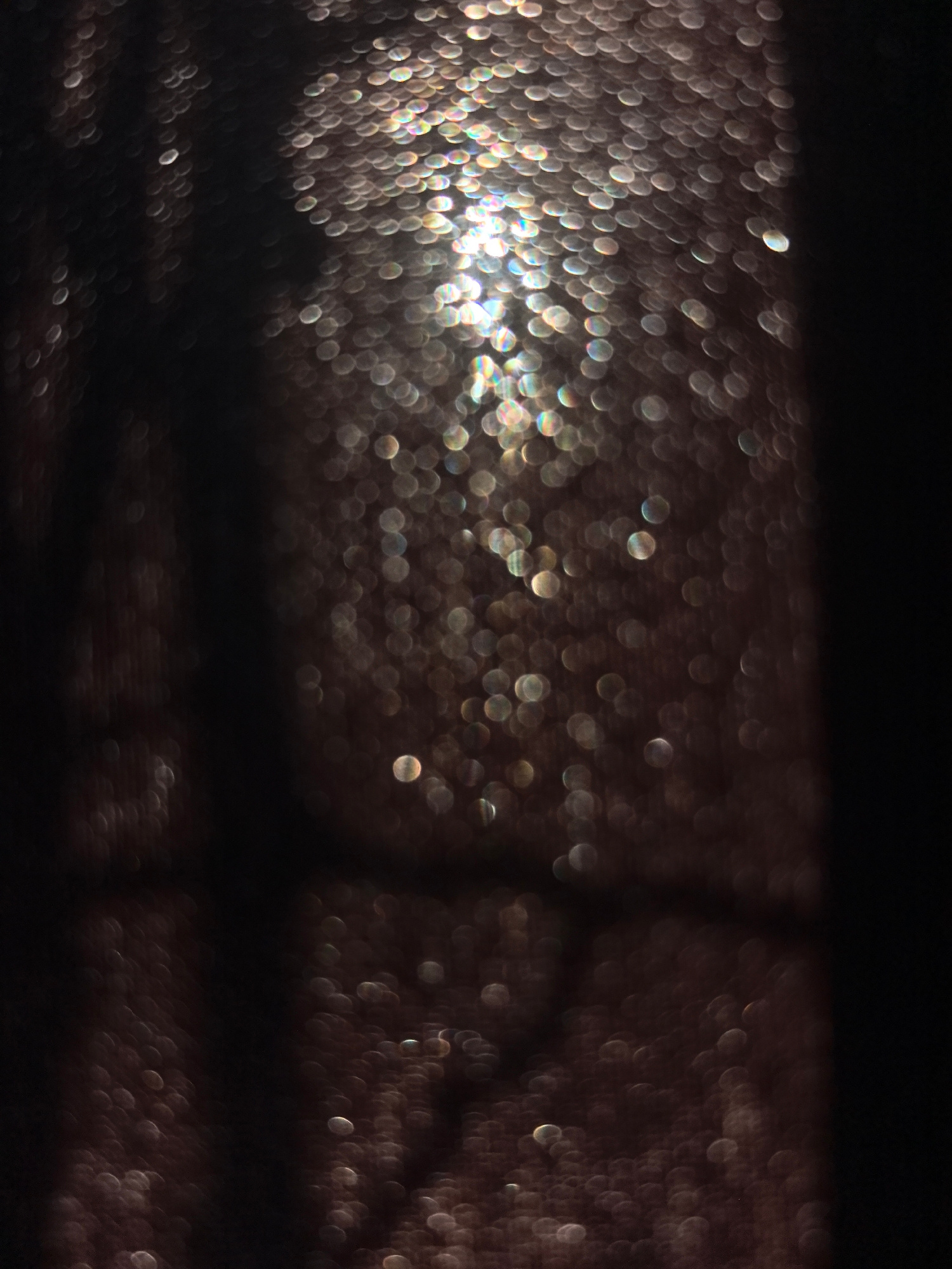 The image shows an out-of-focus view through a window covered in water droplets. The water droplets create bokeh, reflecting a bright light source in the center, surrounded by a dark environment. The…read more