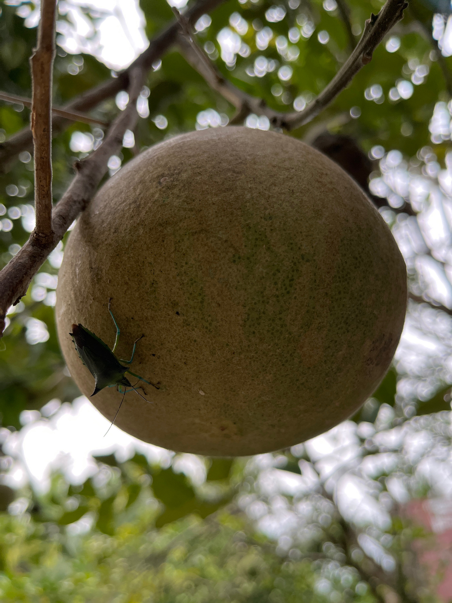 The image is an upward shot focusing on a green fruit hanging from a tree, likely in Lhokseumawe, Indonesia. A dark green insect, possibly a stink bug, is clinging to the bottom of the fruit. The frui…read more