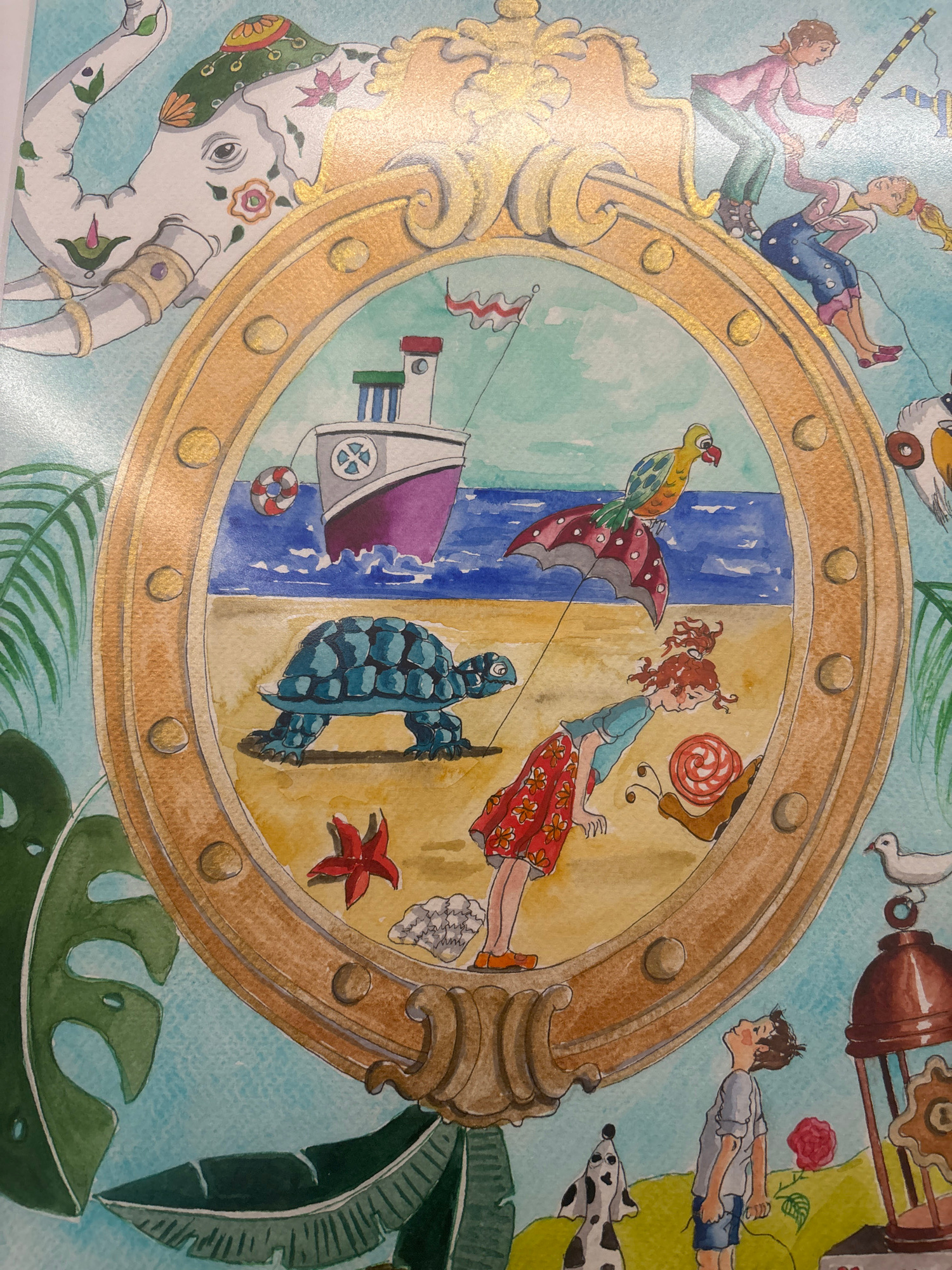 A watercolor painting depicts a fantastical scene framed by an oval gold-colored border. Inside the border, the image is divided vertically. The left side features a blue seascape with a boat and a fl…read more