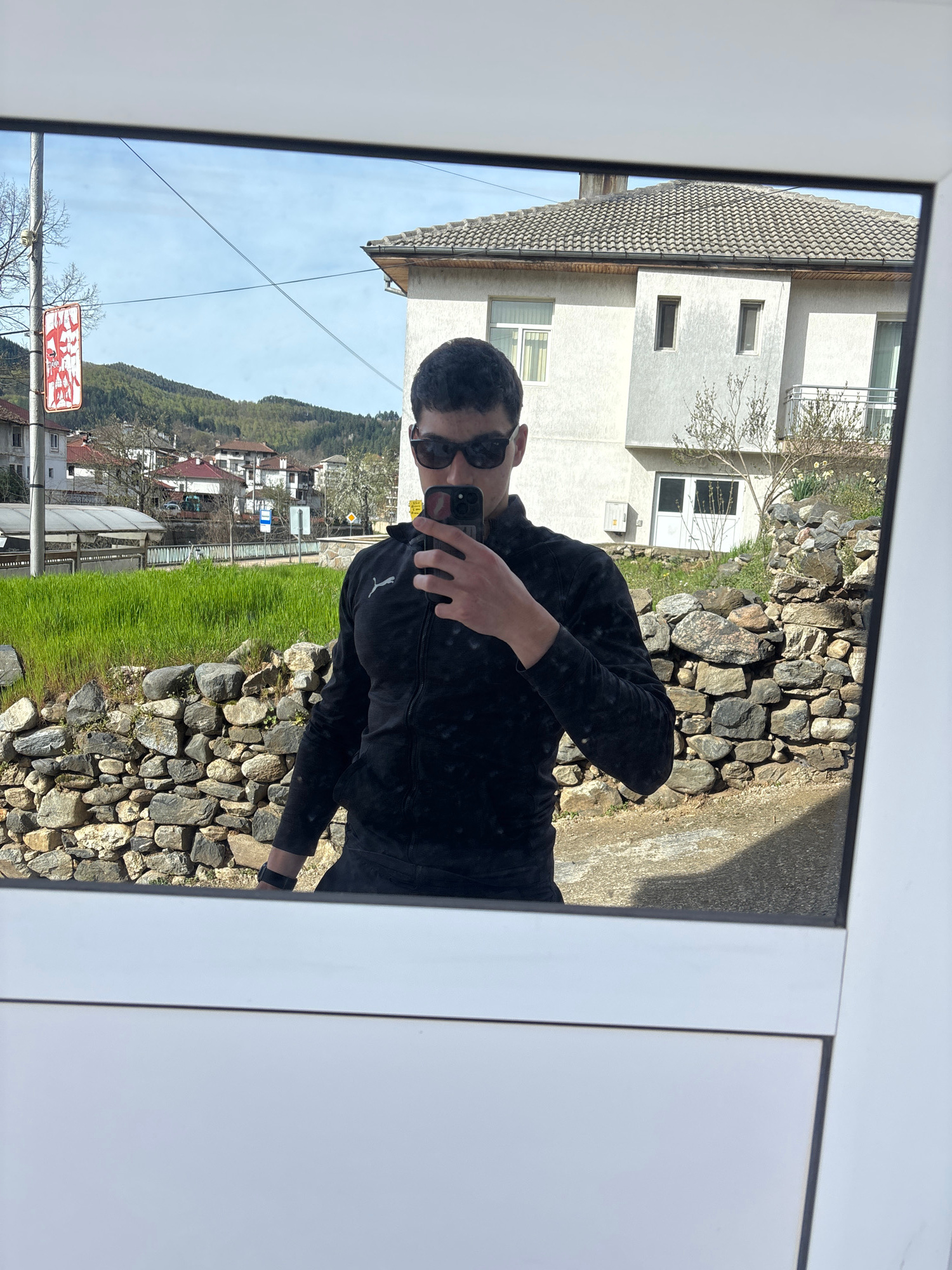 The image displays a selfie reflection of an individual in a window or glass door, set in Zlatograd, Bulgaria. The person is wearing dark sunglasses and a black hooded jacket, which features a white P…read more
