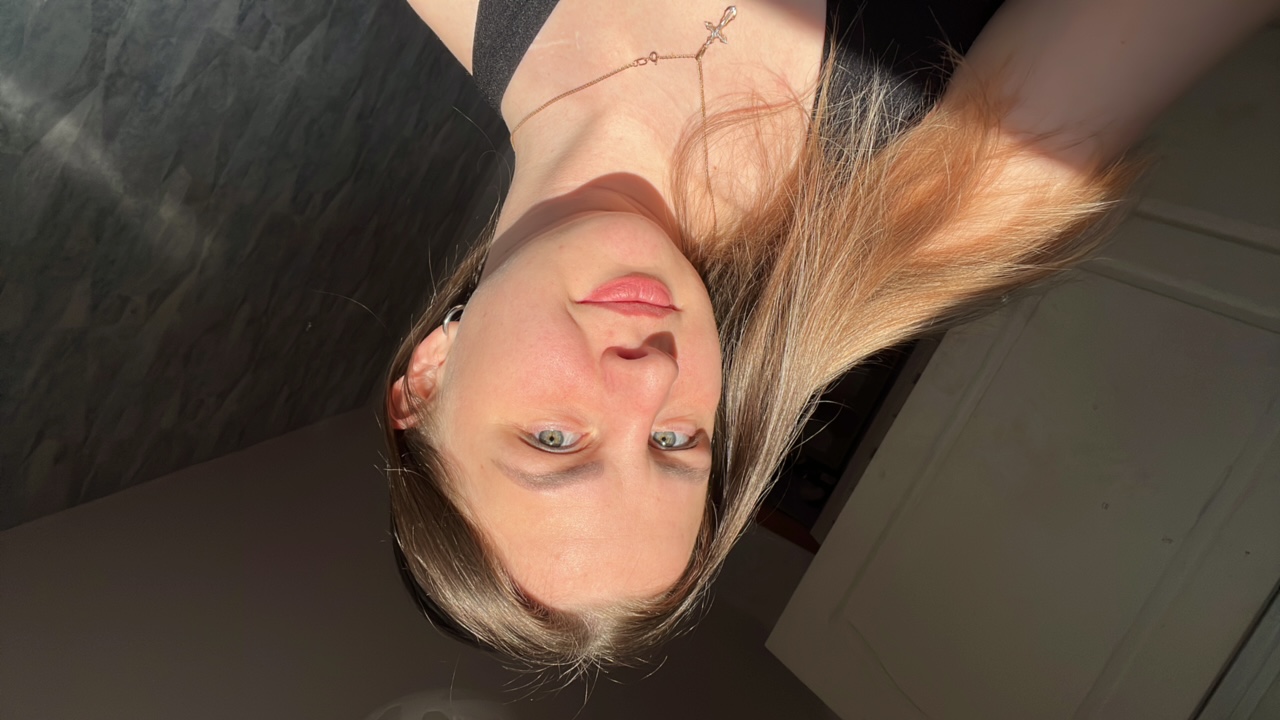 A young adult female is captured in a bright, naturally lit indoor selfie, taken from an overhead and slightly rotated perspective. The woman, with light-to-medium brown hair mostly pulled back, looks…read more