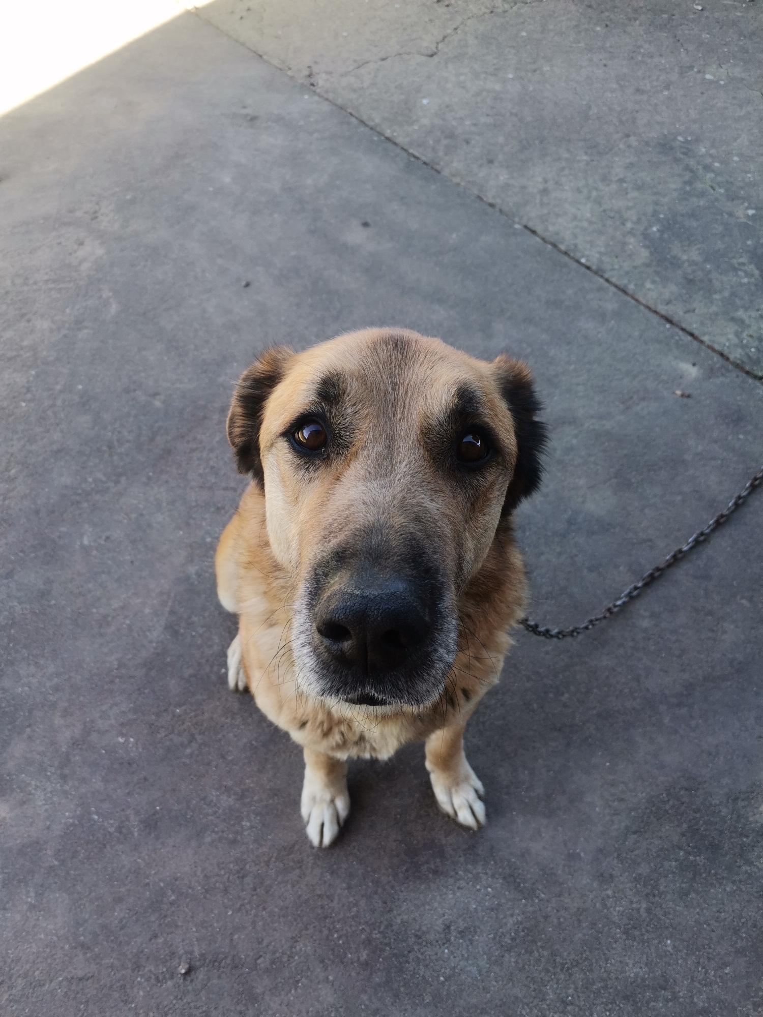 A medium-sized, tan and brown dog sits on a concrete surface, looking directly at the camera. The dog has dark eyes, a black nose, and white paws. A metal chain is visible to the right of the dog. The…read more