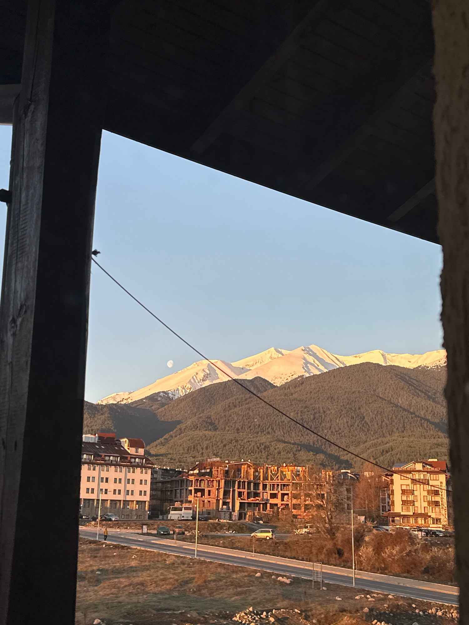 The image shows a view from inside a wooden structure, possibly a building or shed, looking out toward a mountain range, a town, and a road. The view is framed by the dark wooden beams of the structur…read more