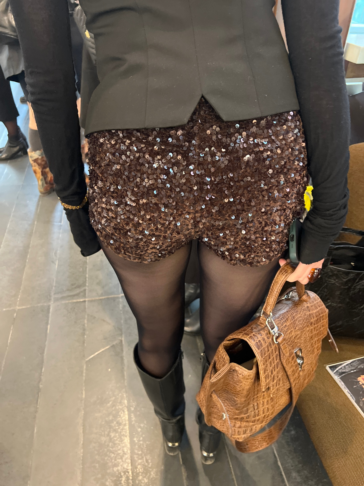 A view from above shows a person seated in an indoor setting. The person is wearing a black long-sleeved top, sequined shorts, black tights, and black boots. Next to the person is a brown, textured ha…read more