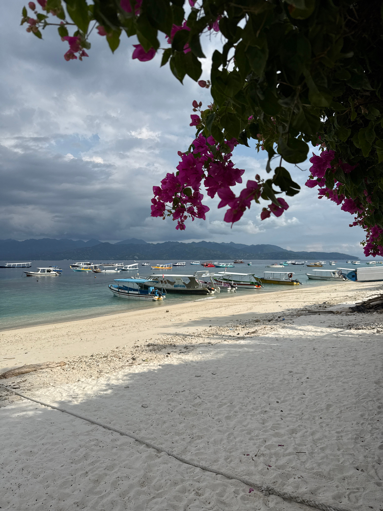The image depicts a beach scene in an unknown location in Indonesia. Several boats are docked along the shoreline. A mountain range is visible in the background under a cloudy sky. Bougainvillea flowe…read more